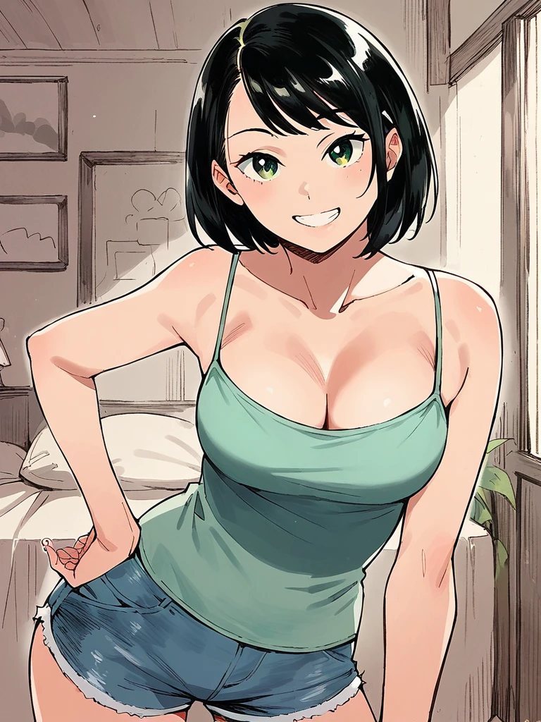 cheena ak, short hair, bob cut, small breasts, tan, one-piece tan,