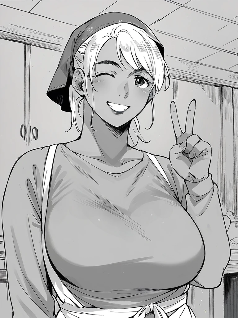 kanae ak, mature female, dark-skinned female, large breasts, ponytail, white hair,