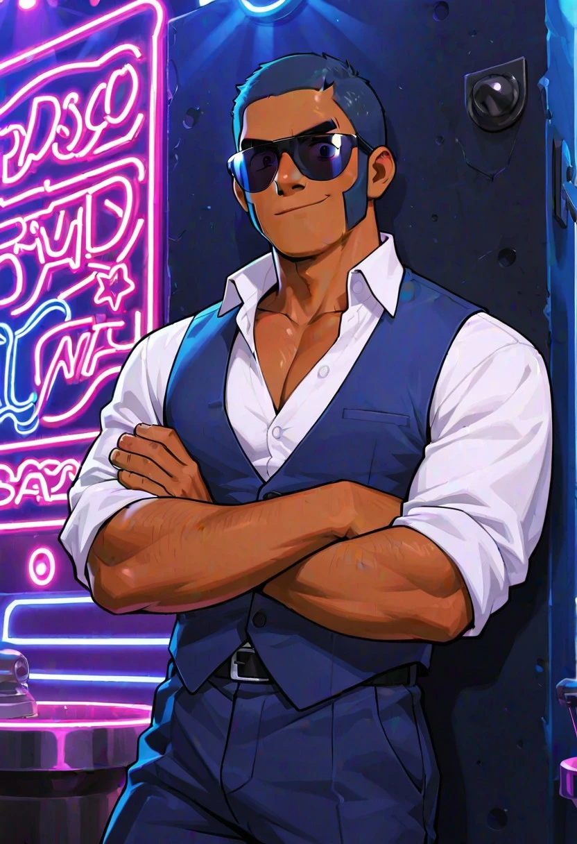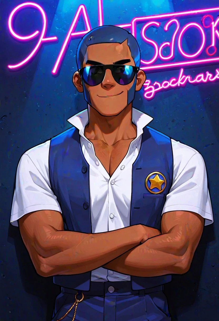 Male, Brock BrawlStars, white shirt, navy blue vest, brown skin, dark blue hair, sideburns, shaved hair, dark blue pants, sunglasses,