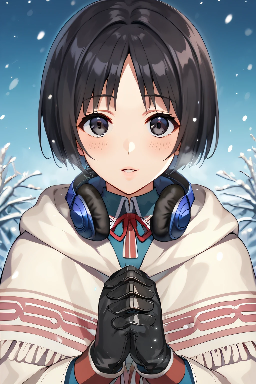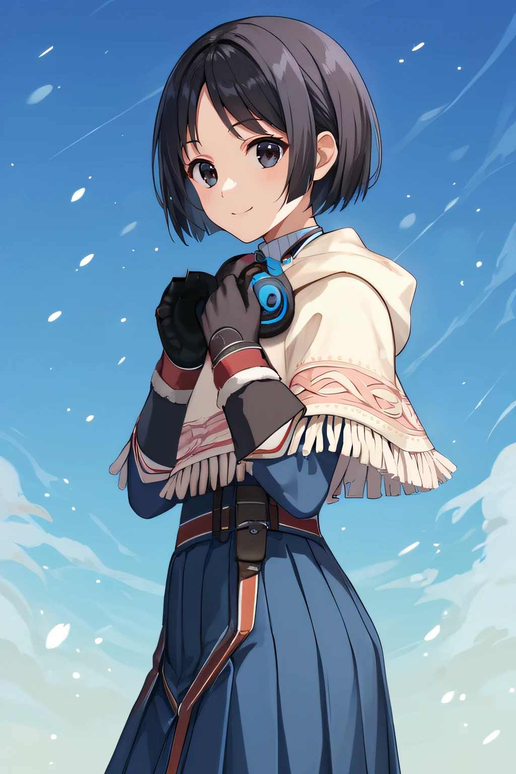military uniform, dark headphones around neck, fringe trim, poncho, black gloves, shawl, blue skirt, blue thighhighs, black knee boots, fur boots