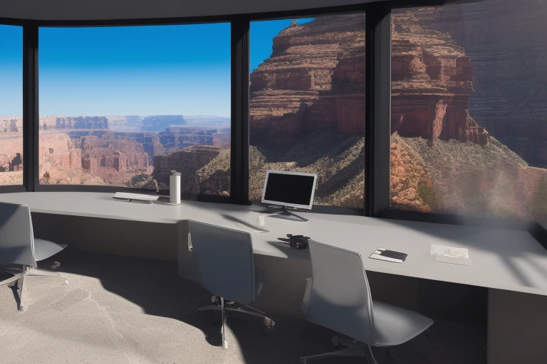 Prompt: (Interior POV:1.3), a professional photo taken from inside a futuristic glass lab, looking out at the vast <gc_real> canyon. A sleek desk and a modern chair in the foreground, huge panoramic window. Sunset light, glowing atmosphere, highly detailed rock texture, 8k, cinematic.