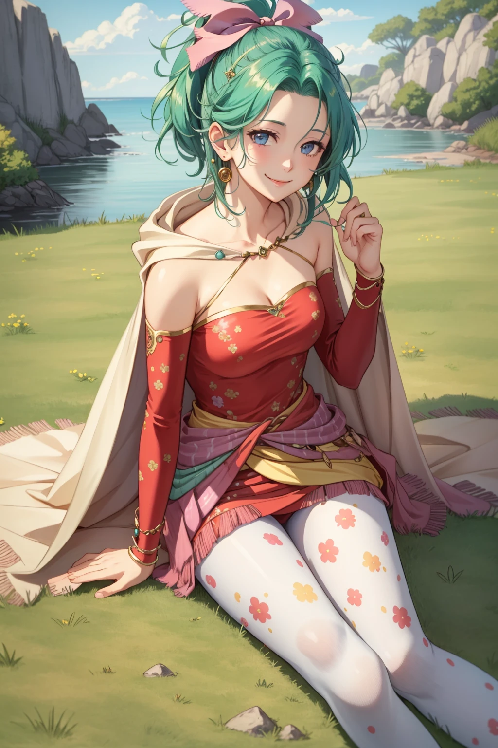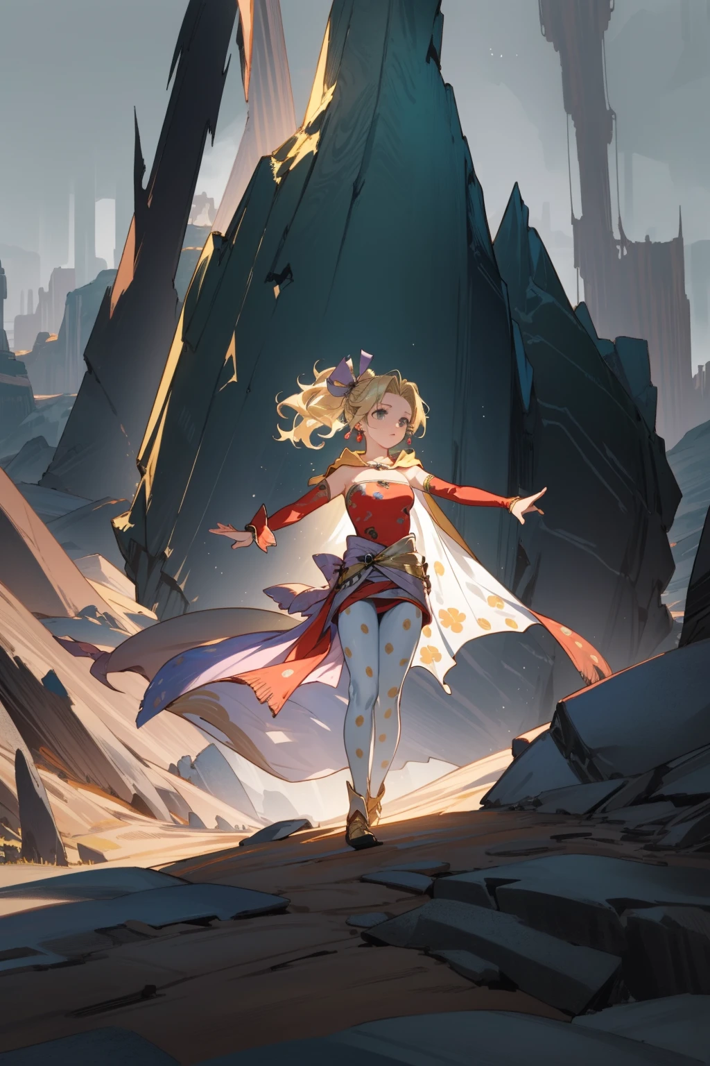 Add "cape, earrings, red dress, detached sleeves, hair ribbon, clothes around waist, print legwear, red boots" for her typical look.