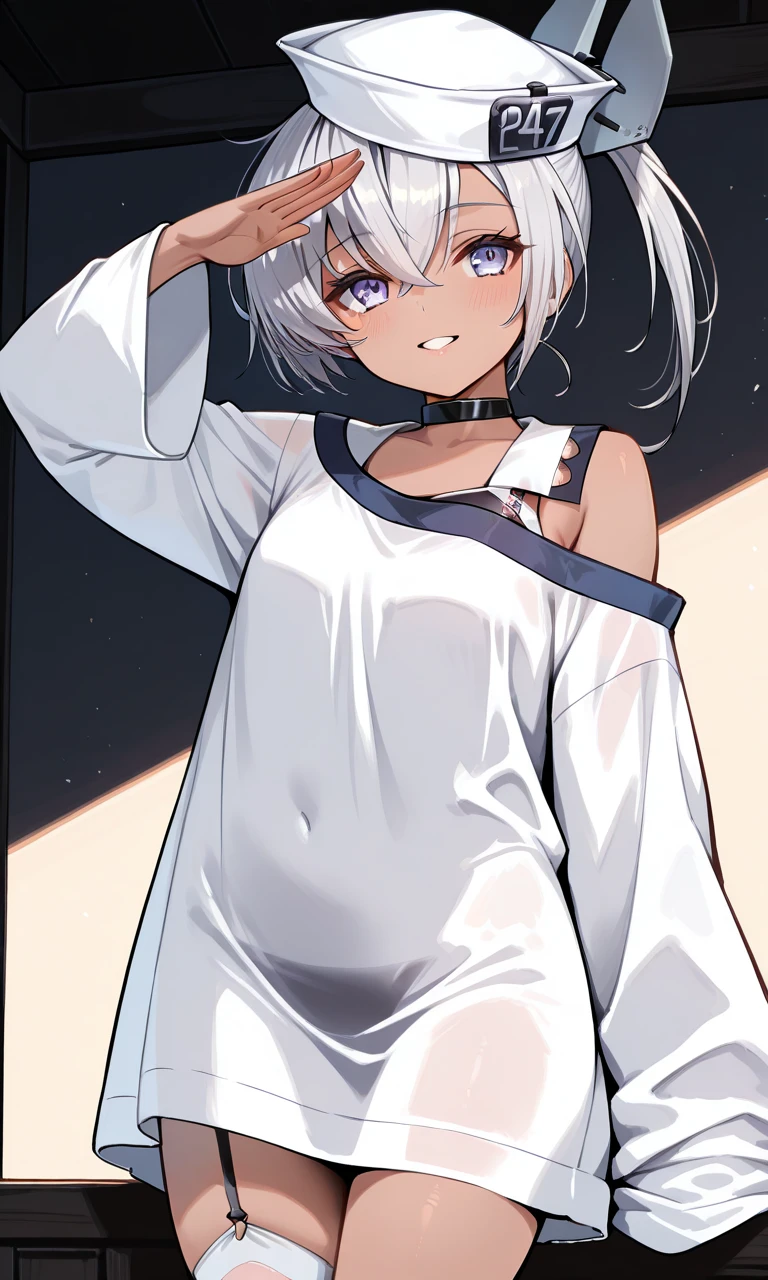 Default Outfit : daceKC,short hair, long sleeves, dress, hat, hair between eyes, socks, dark skin, off shoulder, white thighhighs, side ponytail, sleeves past wrists, black choker, white headwear, single_garter_strap, single thighhigh, sleeves past fingers, asymmetrical legwear, sailor hat, uneven legwear, oversized clothes, swimsuit_under_clothes,wide_sleeves,