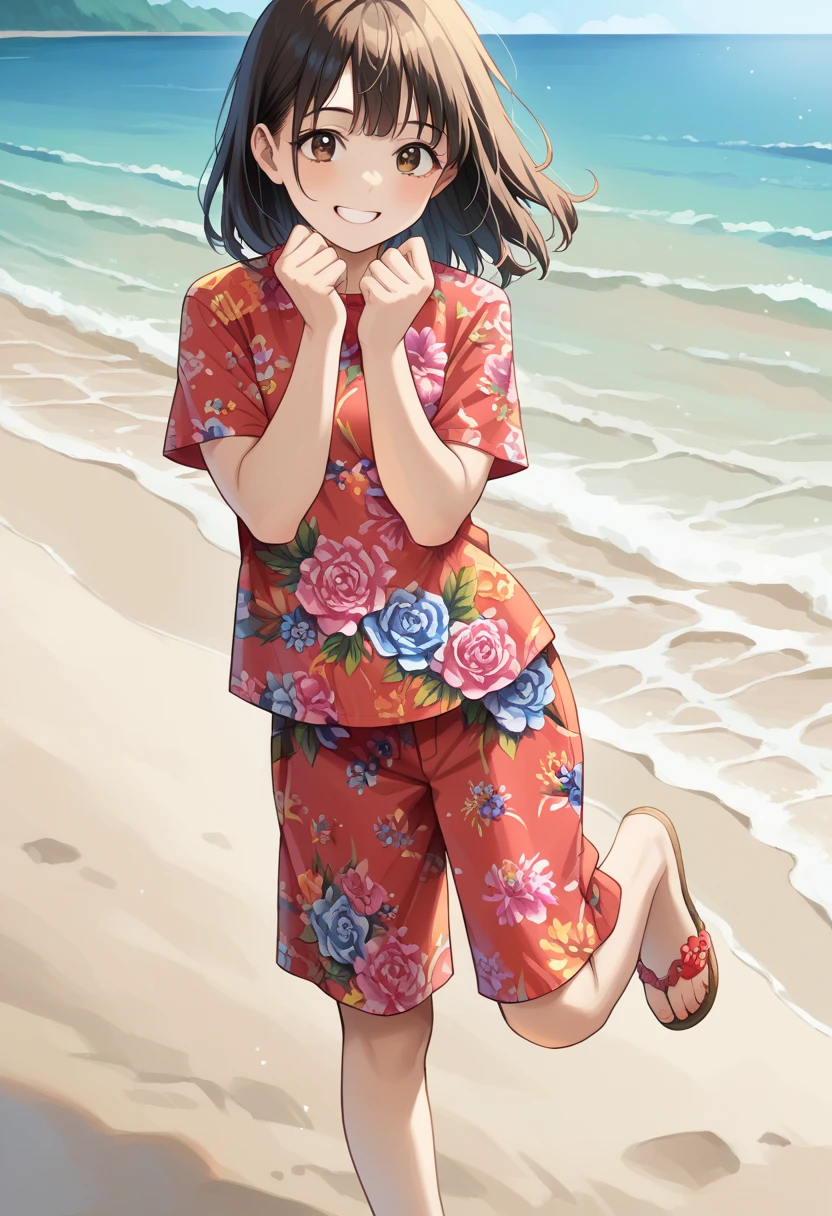 floral print, print shirt, blue flower, pink flower, short sleeves, red shirt, print shorts, 1girl, (black eyes:1.8), (black hair:1.8),