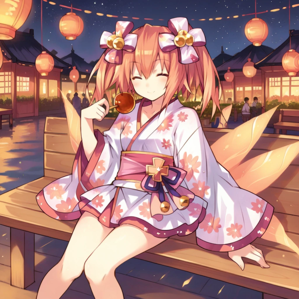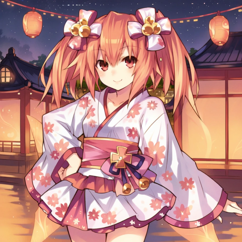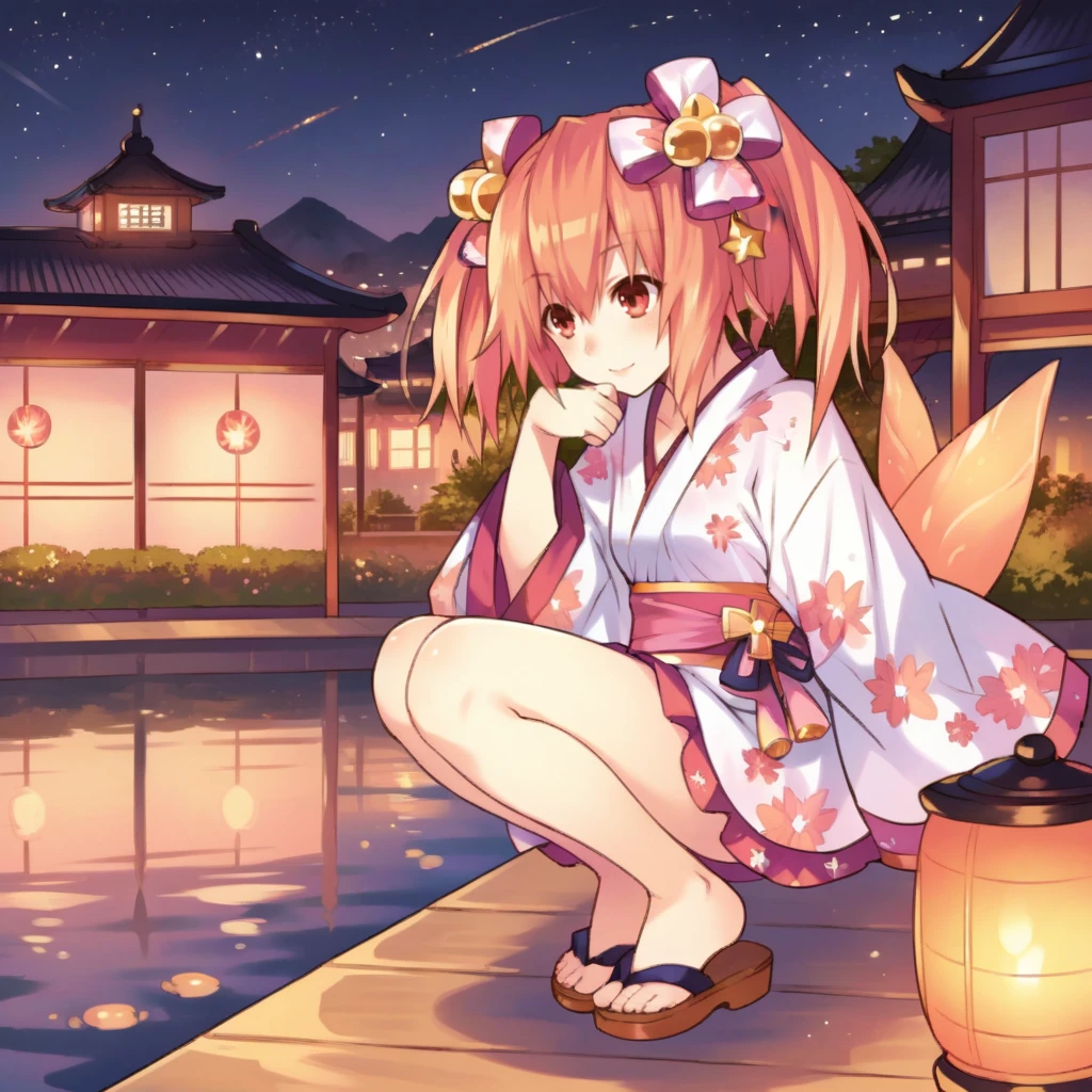 Er_JP, alt hair ornament, kimono, short kimono, layered skirt, alt skirt, white skirt, floral print, alt wide sleeves, white sleeves, bell, pink skirt, hair bell, pink bow, sash, pink sash, Swimsuit Outfit: