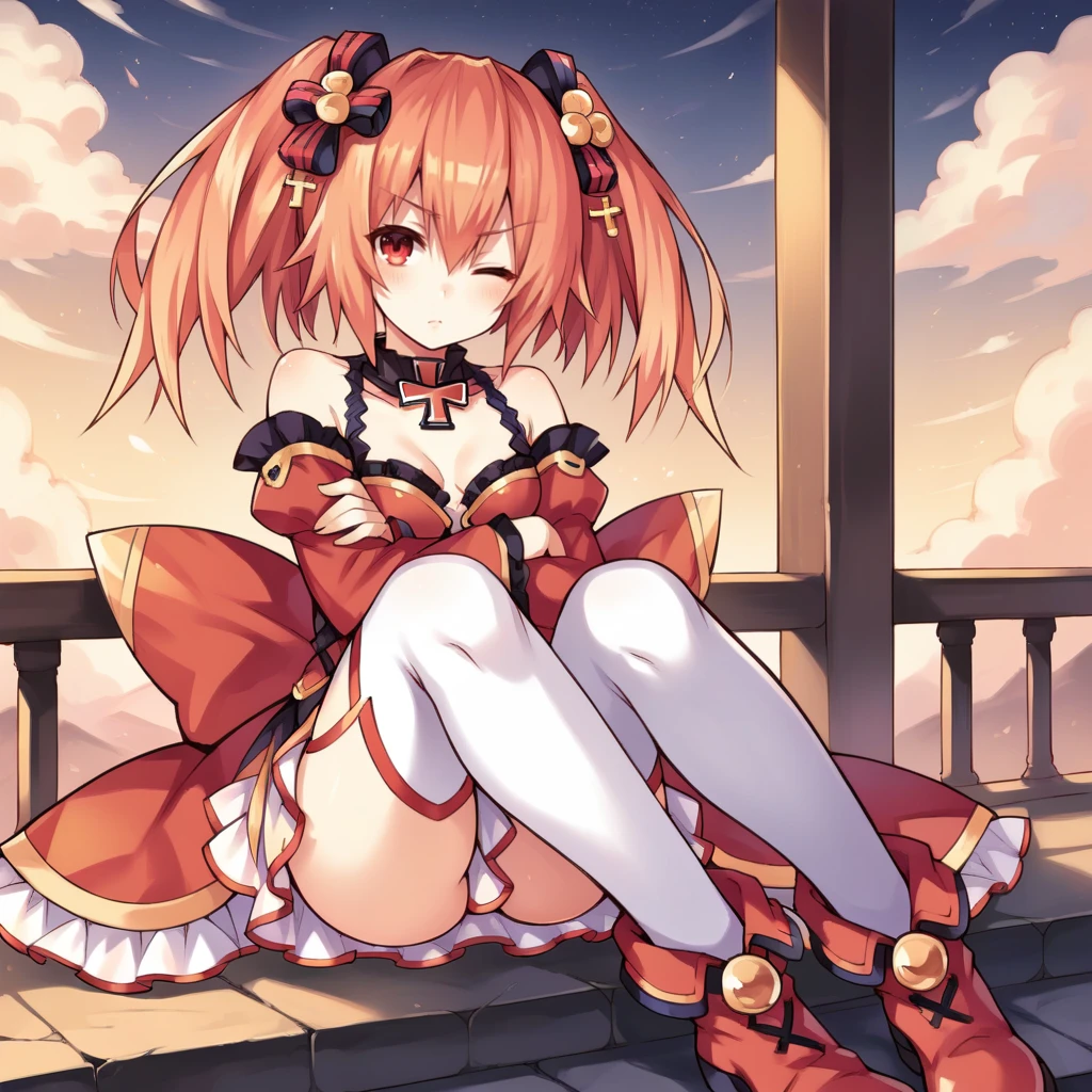 cross-laced clothes, red dress, frilled skirt, white skirt, shoulder straps, sleeves past wrists, detached collar, black collar, jewelry, white thighhighs, ankle boots, red boots, detached sleeves, frilled sleeves, bare shoulders, long sleeves, wide sleeves, red sleeves, hair ornament,Kimono Outfit:
