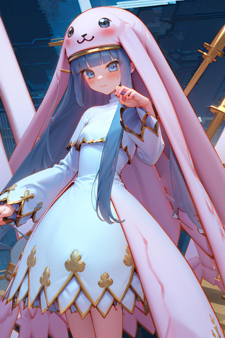 示 chibiki, slender, loli, Sistermon Blanc, 1girl, solo, white hair, long hair, grey eyes, white footwear, blush, dress, open mouth, simple background, bangs, blunt bangs, knee boots, long sleeves, sidelocks,