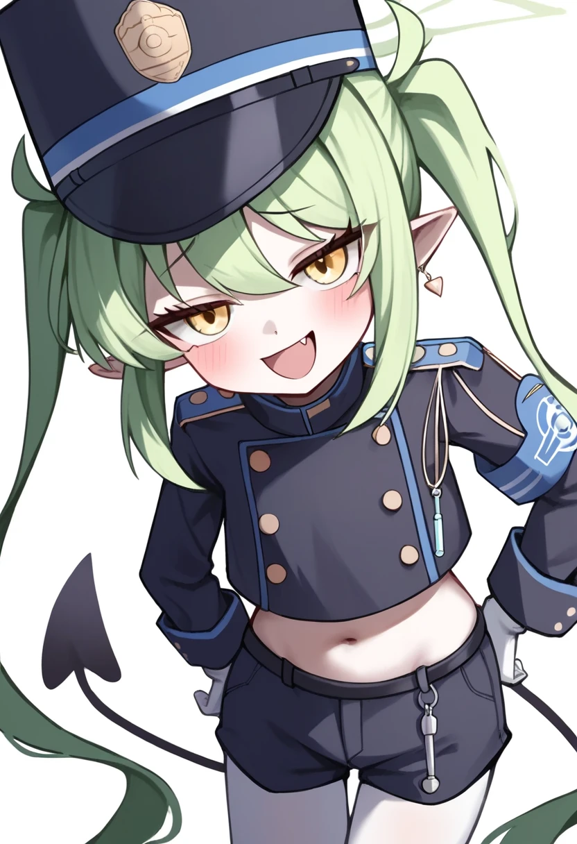 nozomi_\(blue_archive\), green_hair, yellow_eyes, 1girl, pointy_ears, twintails, white_gloves, long_sleeves, white_pantyhose, peaked_cap, long_hair, demon_tail, black_hat