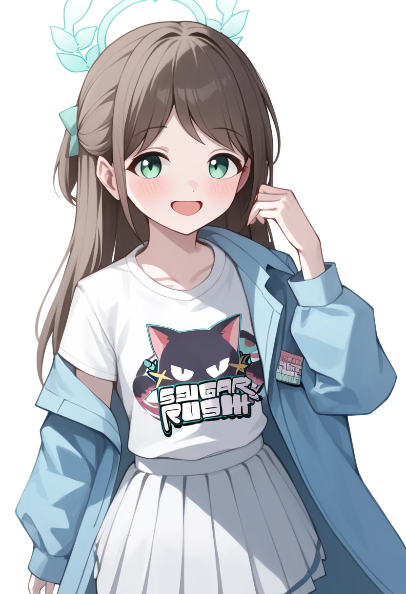 airi_\(band\)_\(blue_archive\), 1girl, airi_\(blue_archive\), white_shirt, pleated_skirt, print_shirt, white_skirt, blue_jacket, open_jacket, official_alternate_costume, hair_bow, long_sleeves