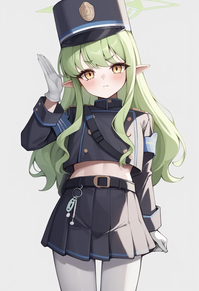 hikari_\(blue_archive\), 1girl, green_hair, yellow_eyes, pointy_ears, white_gloves, long_hair, long_sleeves, green_halo, peaked_cap, demon_tail, white_pantyhose, black_hat