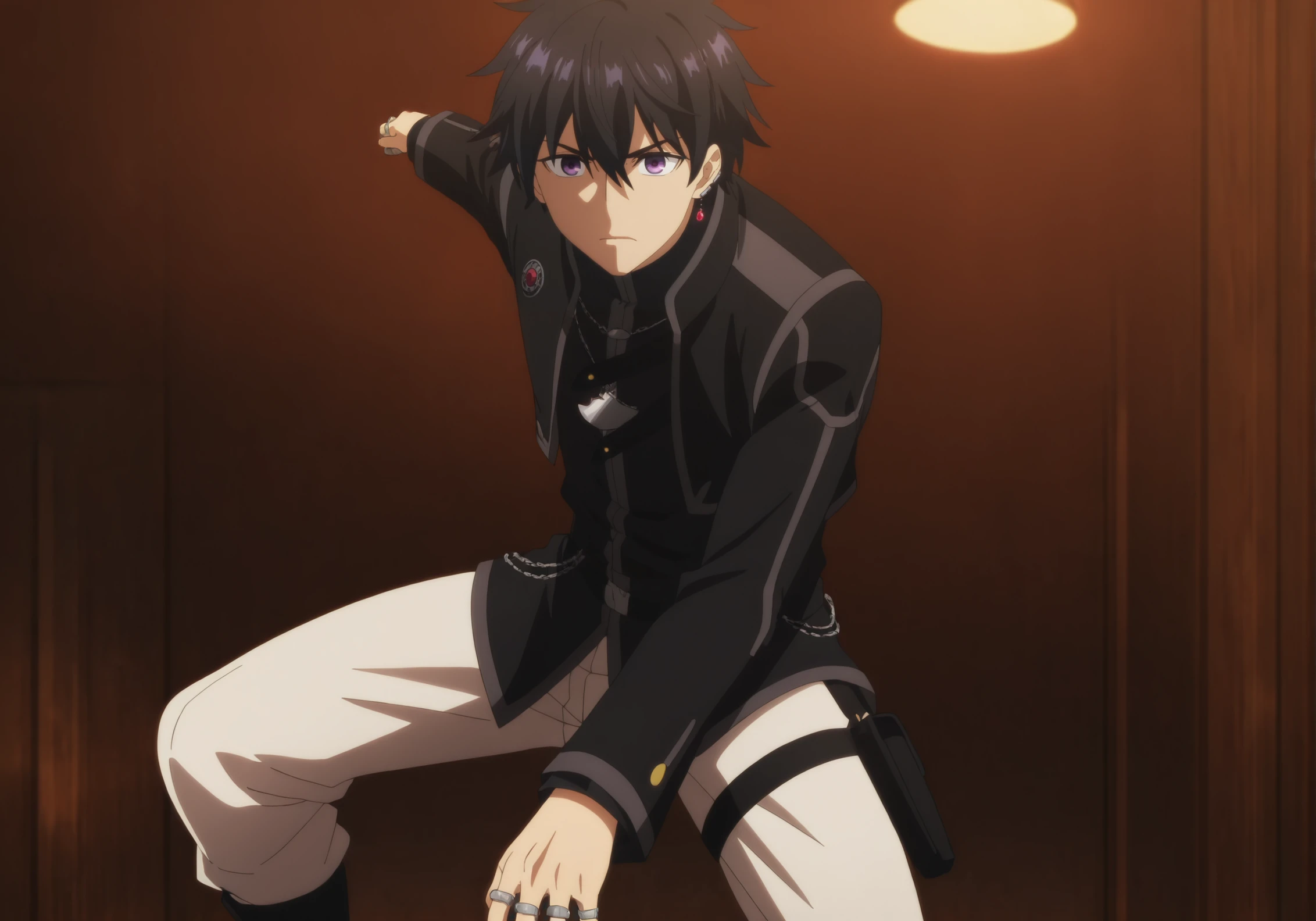 rkraiV1, 1boy, black uniform, red and silver earing, black hair, purple eyes, white pants
