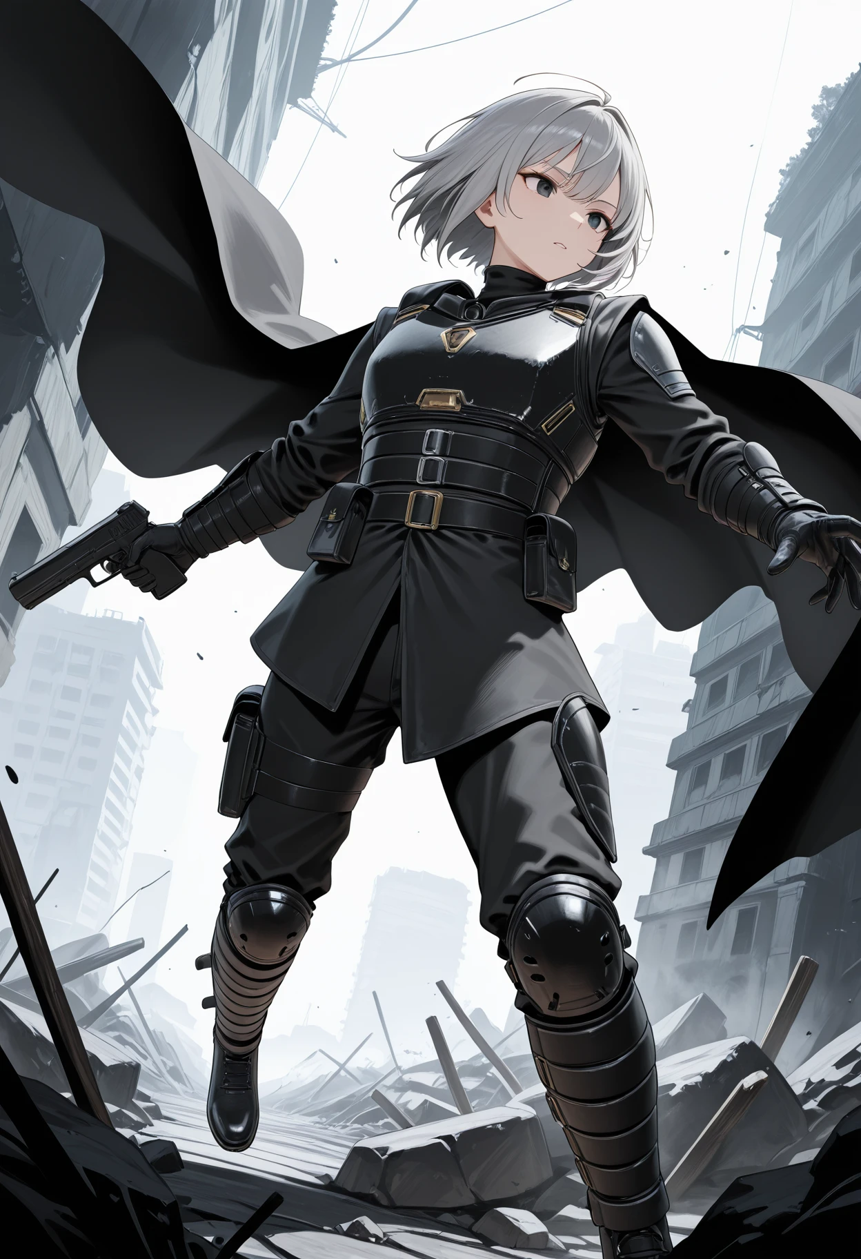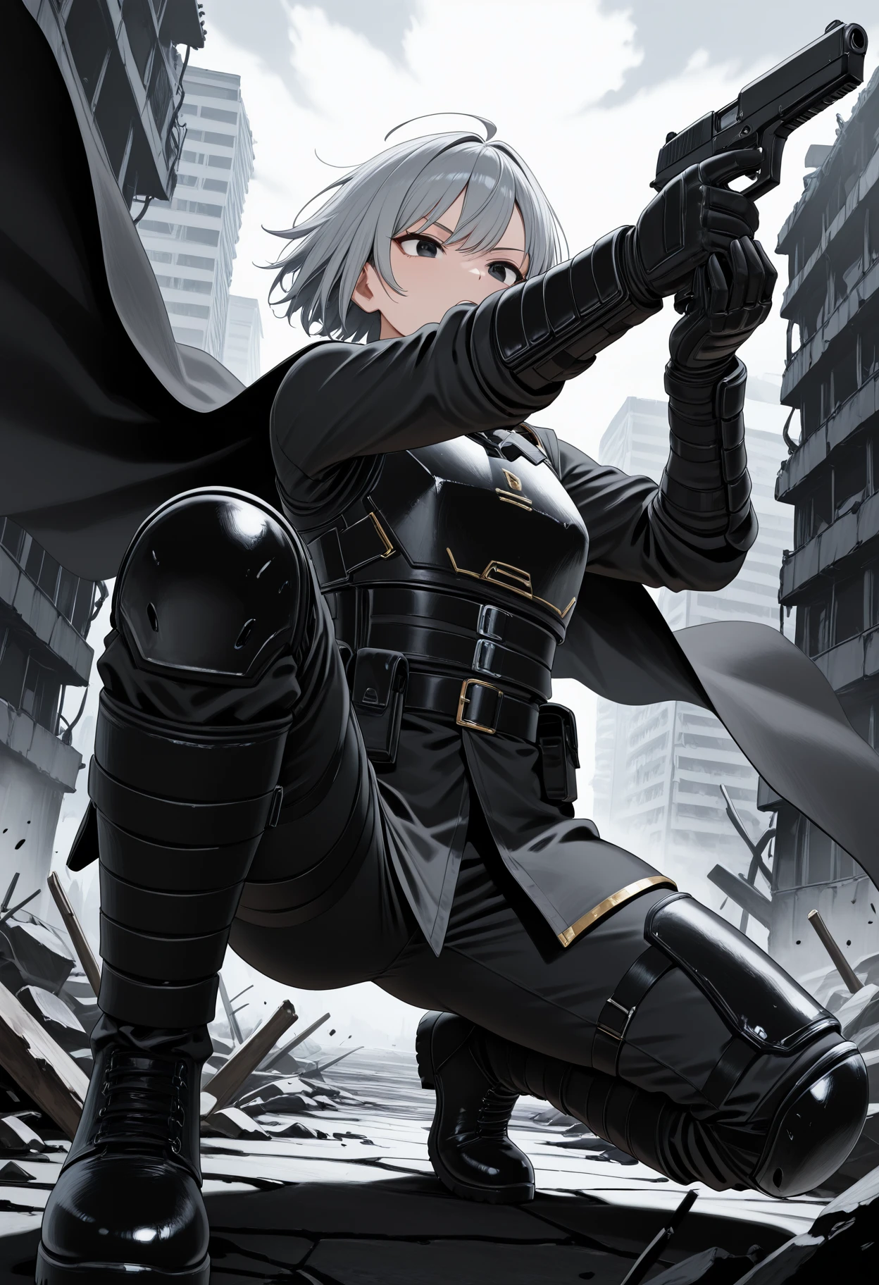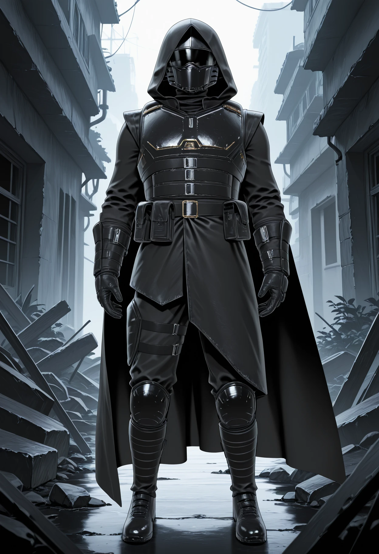 rs100sanctioner, military uniform, black clothing, cuirass, gold trim on cuirass, combat shirt, sleeveless overcoat, bracer, gloves, belt, tactical pouches on belt, pants, single thigh armor, knee pads, black kneepad, boots,