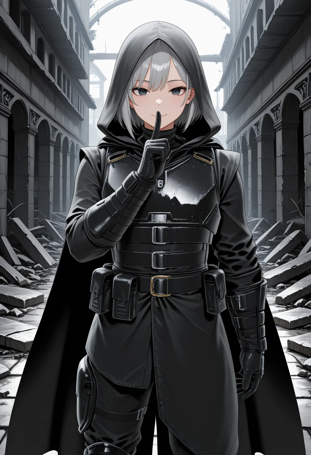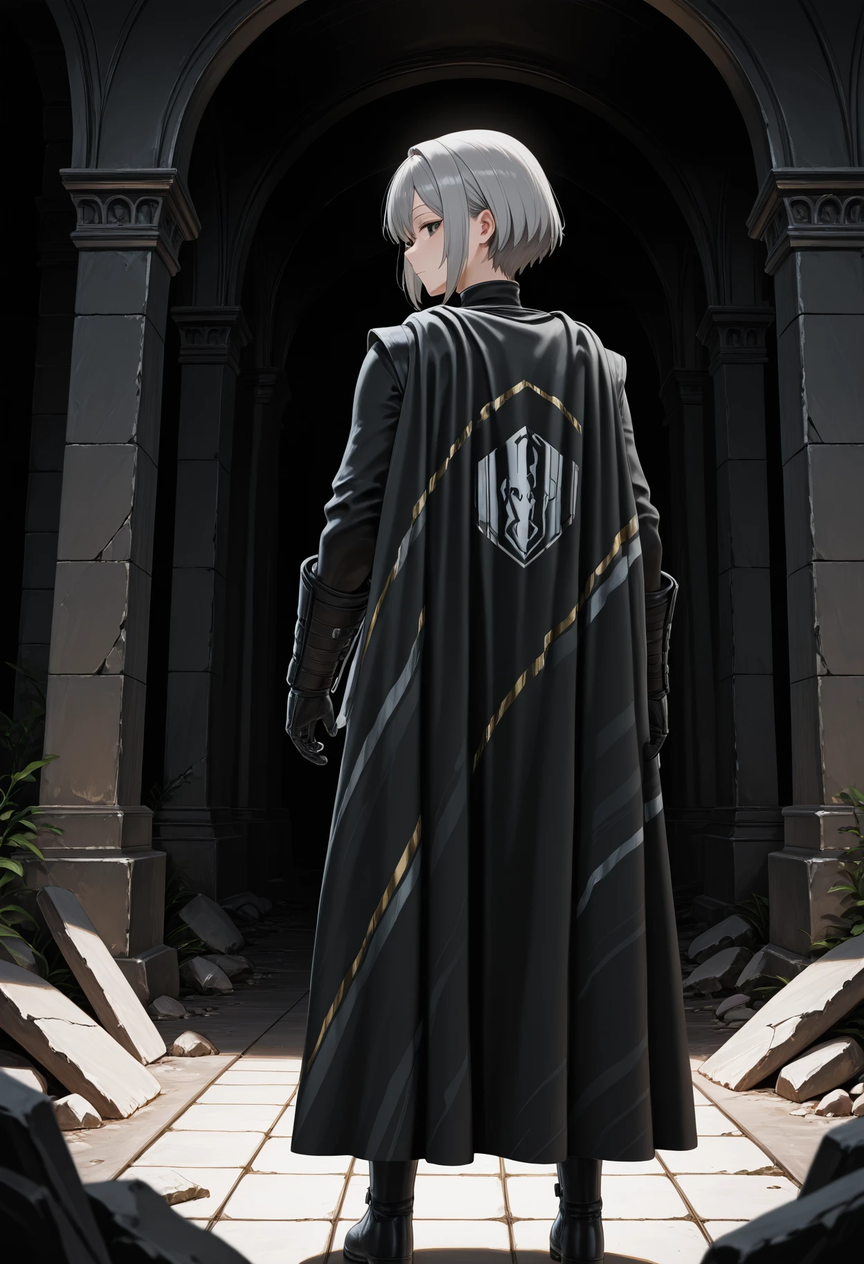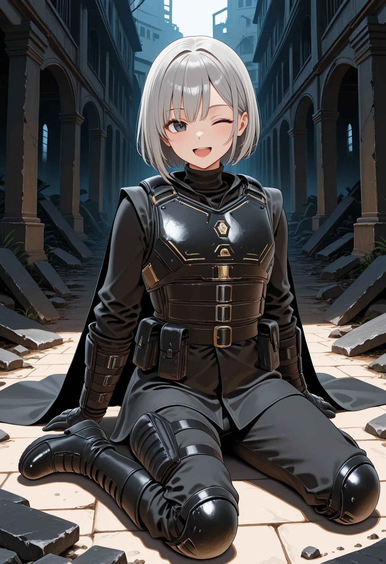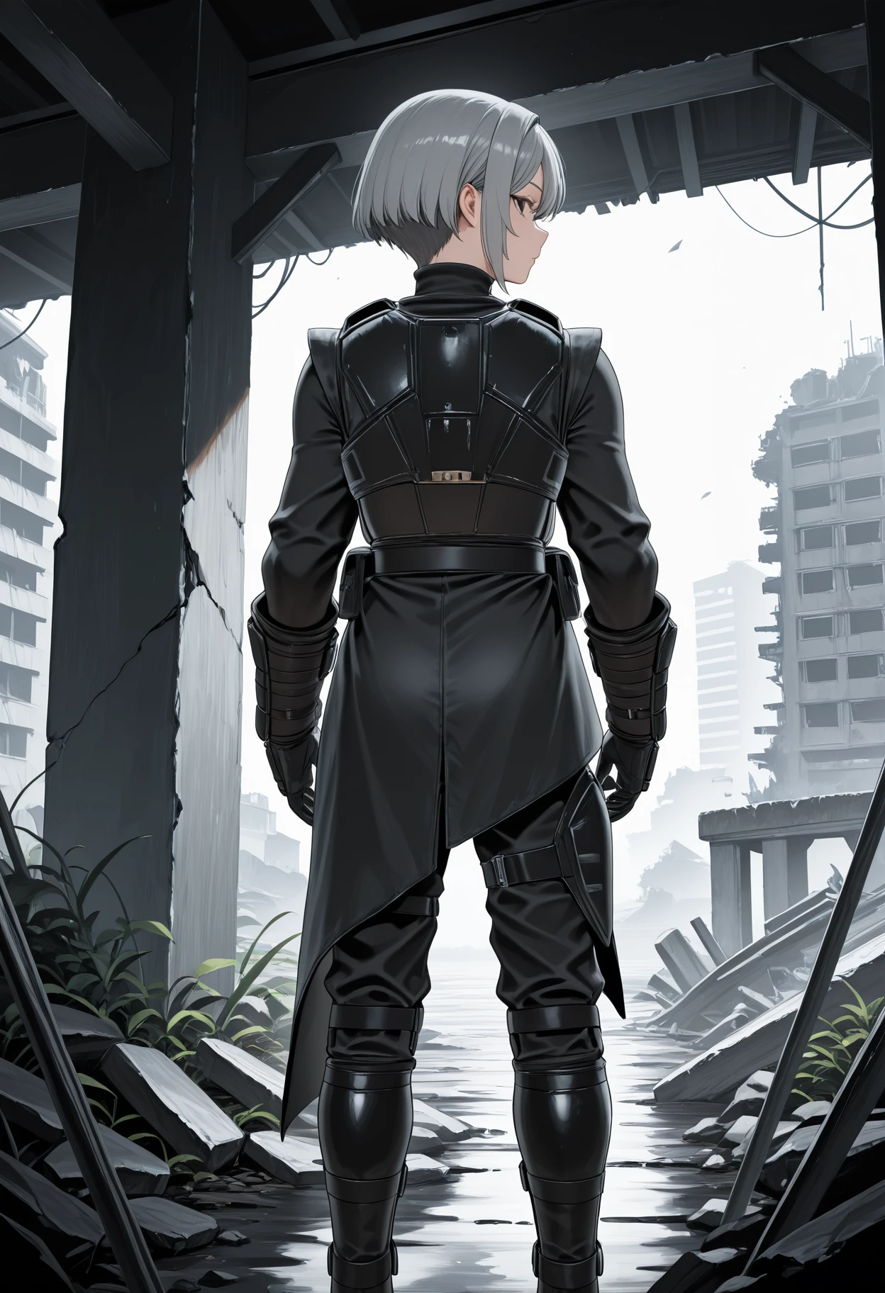 rs100sanctioner, military uniform, black clothing, cuirass, gold trim on cuirass, combat shirt, sleeveless overcoat, bracer, gloves, belt, tactical pouches on belt, pants, single thigh armor, knee pads, black kneepad, boots,