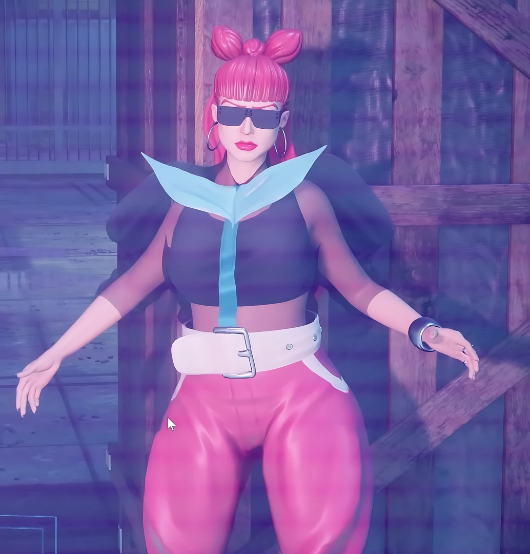 score_9, photorealistic, hyper realistic, ultra detailed, high quality. 1gn!s, pink hair, long hair, two high buns with a small knot between them, straight bangs, blue eyes, pink eyebrows, large black sunglasses, eyeliner, black eyeshadow, red lipstick, hoop earrings, big breasts, thin waist, wide hips, black semi-transparent, long-sleeve sheer jacket, front opening in soft blue fabric, front trim extending into a large scarf-like shape, worn over the crop top, puffy shoulders, black crop top, single metallic bracelet, pink high-waisted pants, large white belt with metallic buckle, pink high-heeled shoes, white shoelaces. night, modern city, full moon, modern buildings. sitting, sexy pose, sensual expression. cinematic lighting, soft light.