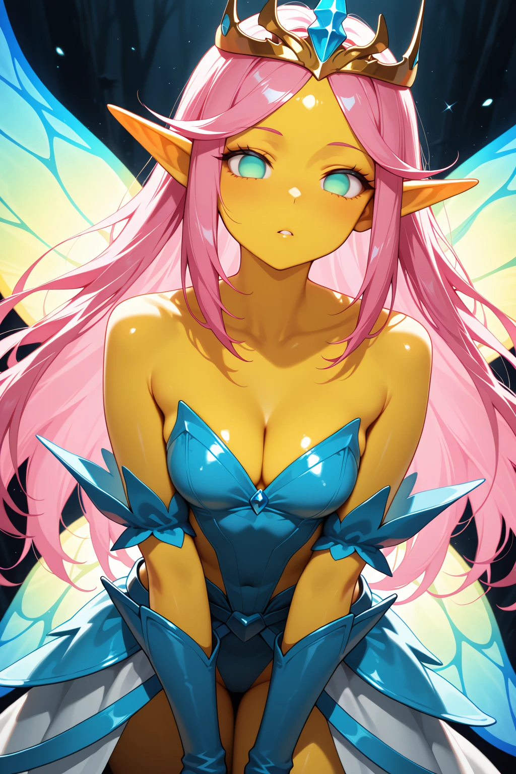 1girl, solo, empress of light, fairy wings, crown, yellow skin, no pupils, long hair, pink hair, bare shoulders,