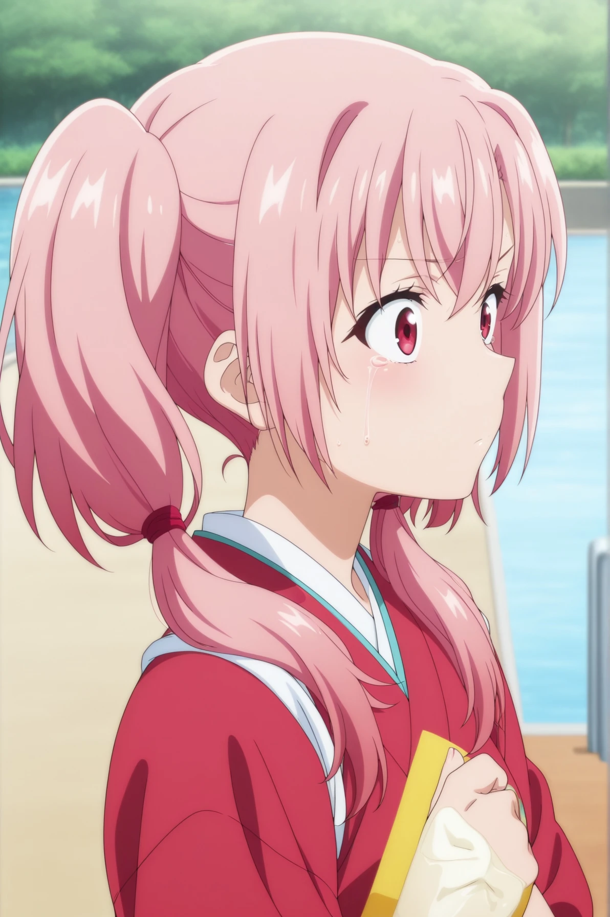 masterpiece, best quality, amazing quality, highres, absurdres, very aesthetic, 1girl, solo, anime style, anime coloring, anime screencap, saya, red eyes, pink hair, twintails, <lora:saya_lora-000001:1>