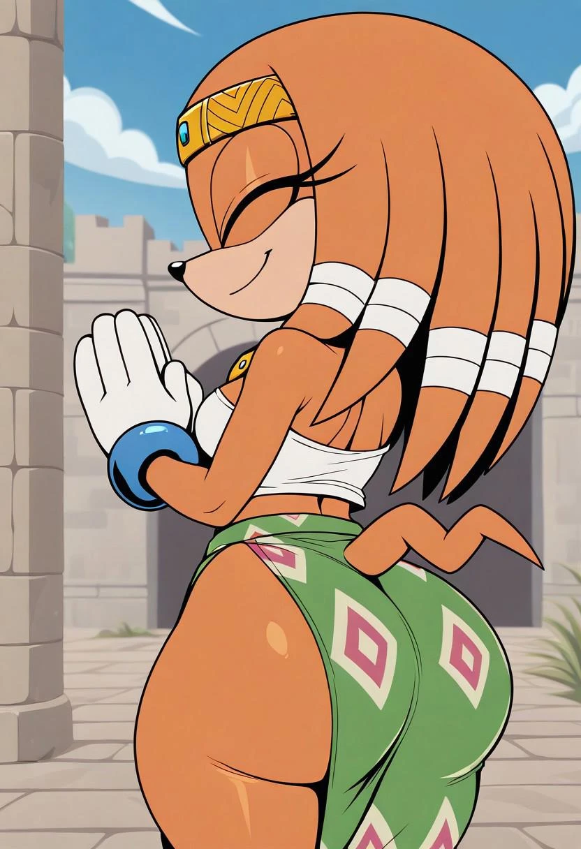 Tikal, echidna, furry, orange skin, peach muzzle, blue eyes, white shirt, green skirt, jewelry, tiara, gold headband, tail, white gloves