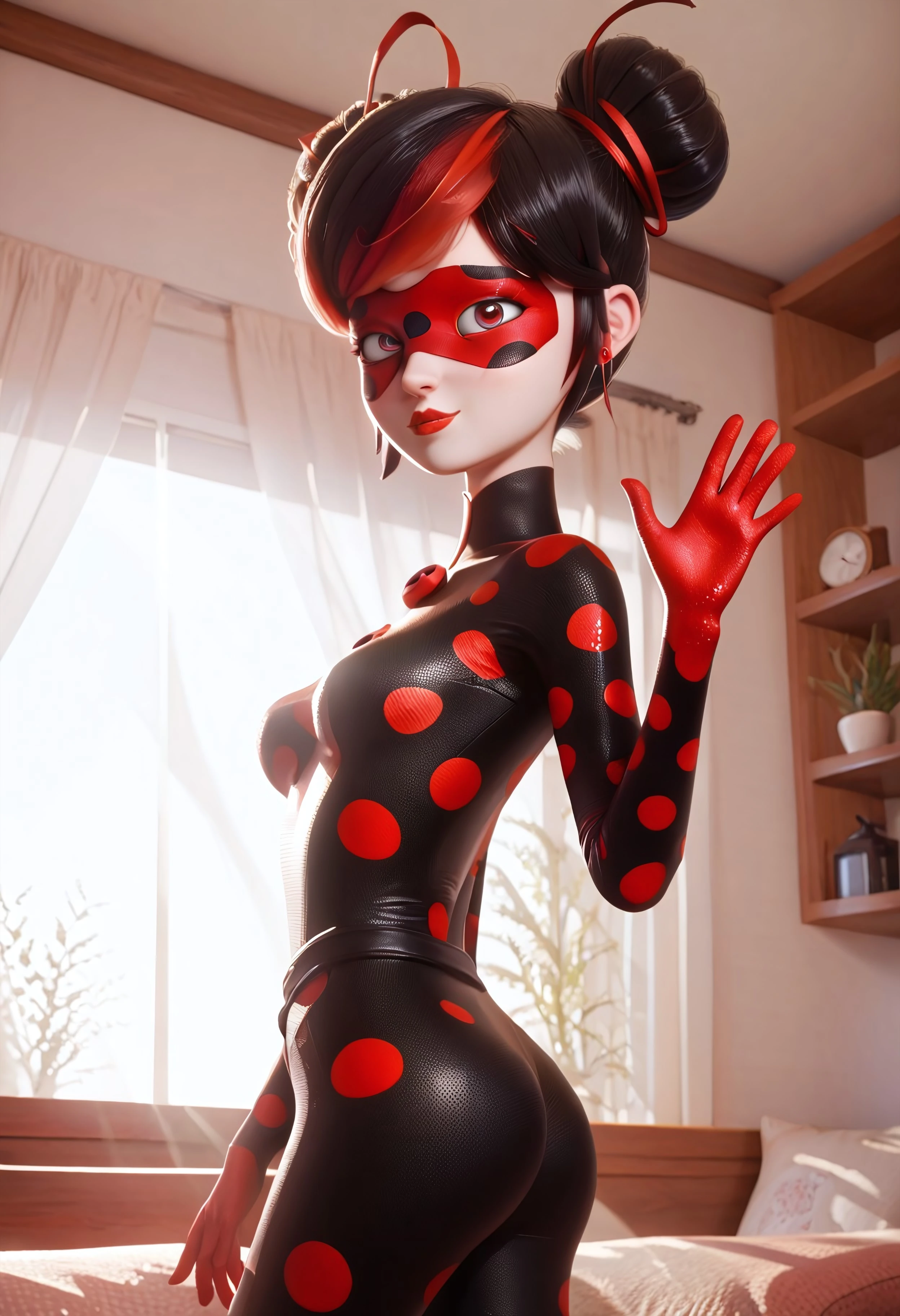 domino mask, mask, bodysuit, red polka dot, black bodysuit