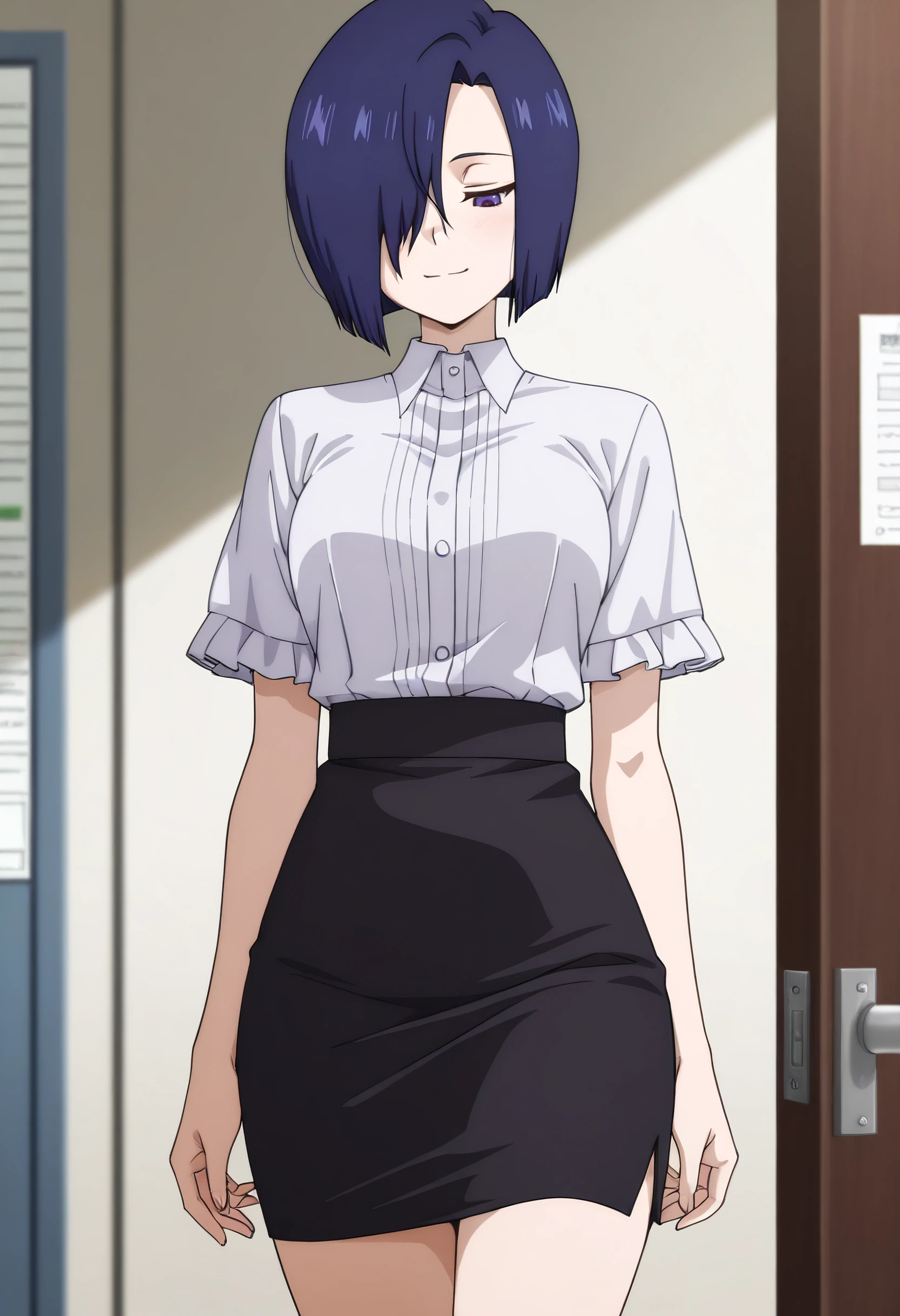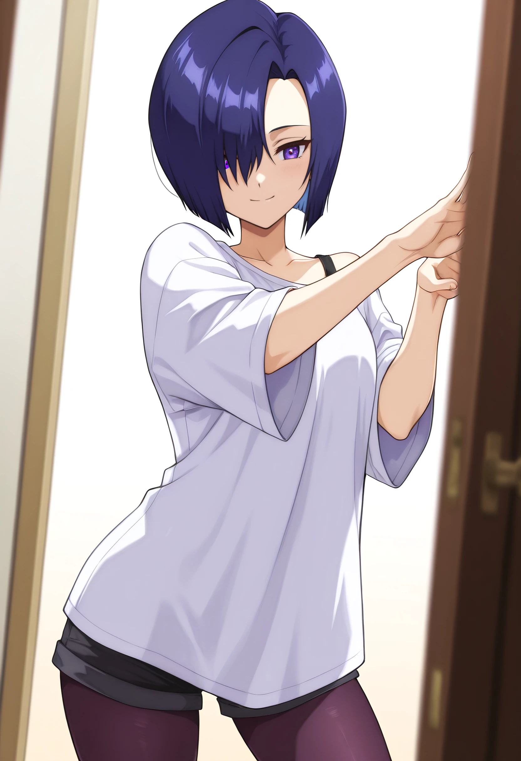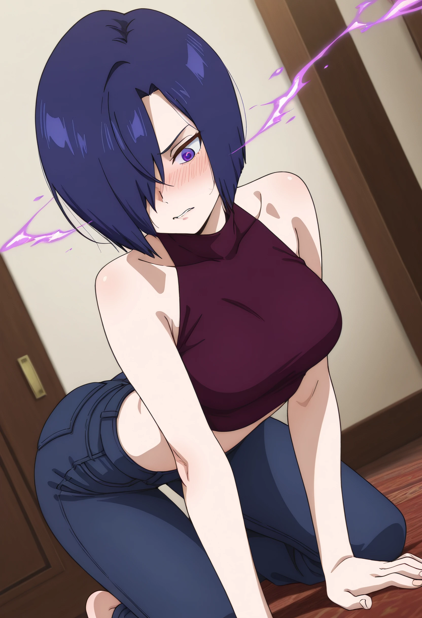 HNMHelena, blue hair, short hair, hair over one eye, purple eyes, bob cut,