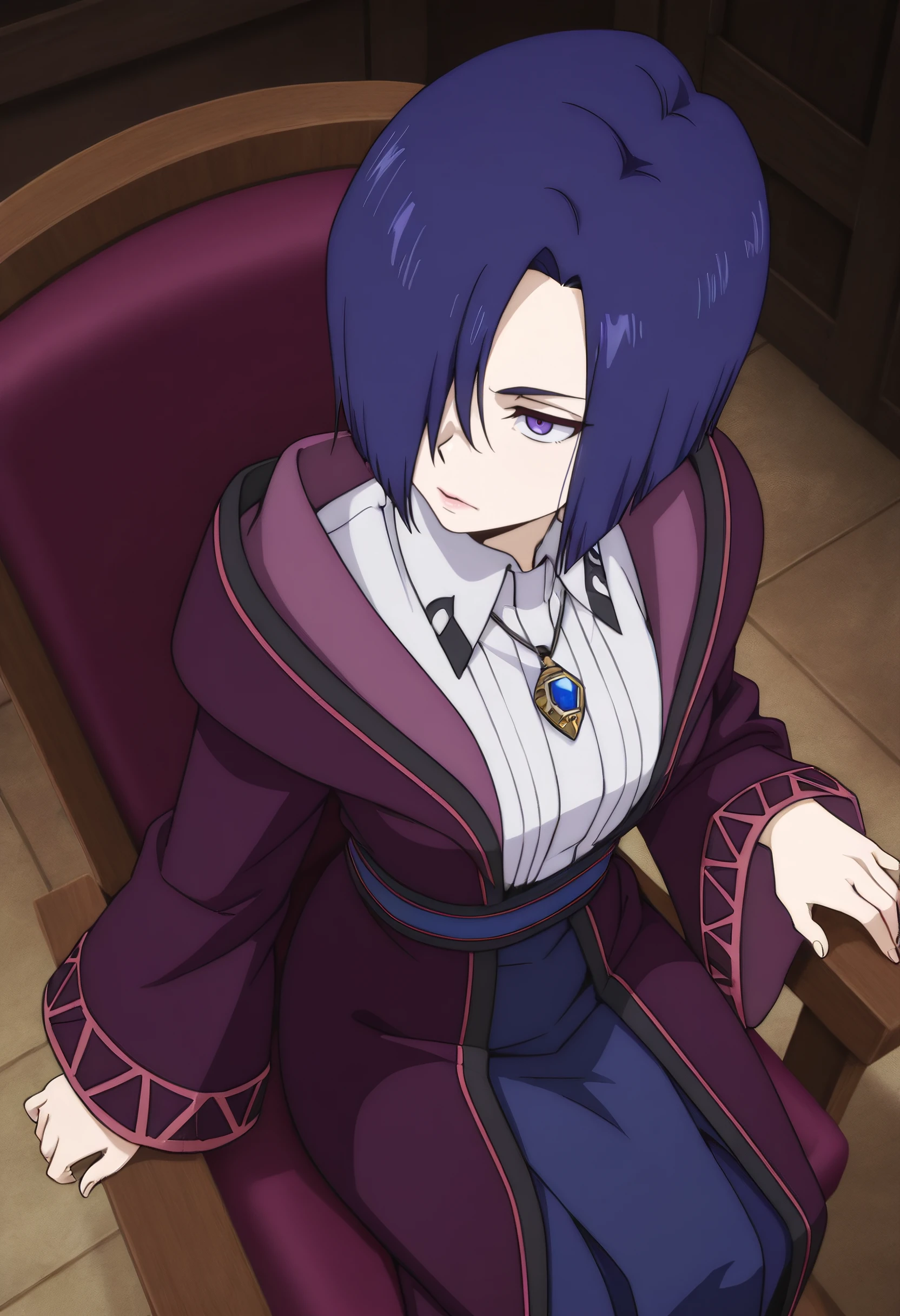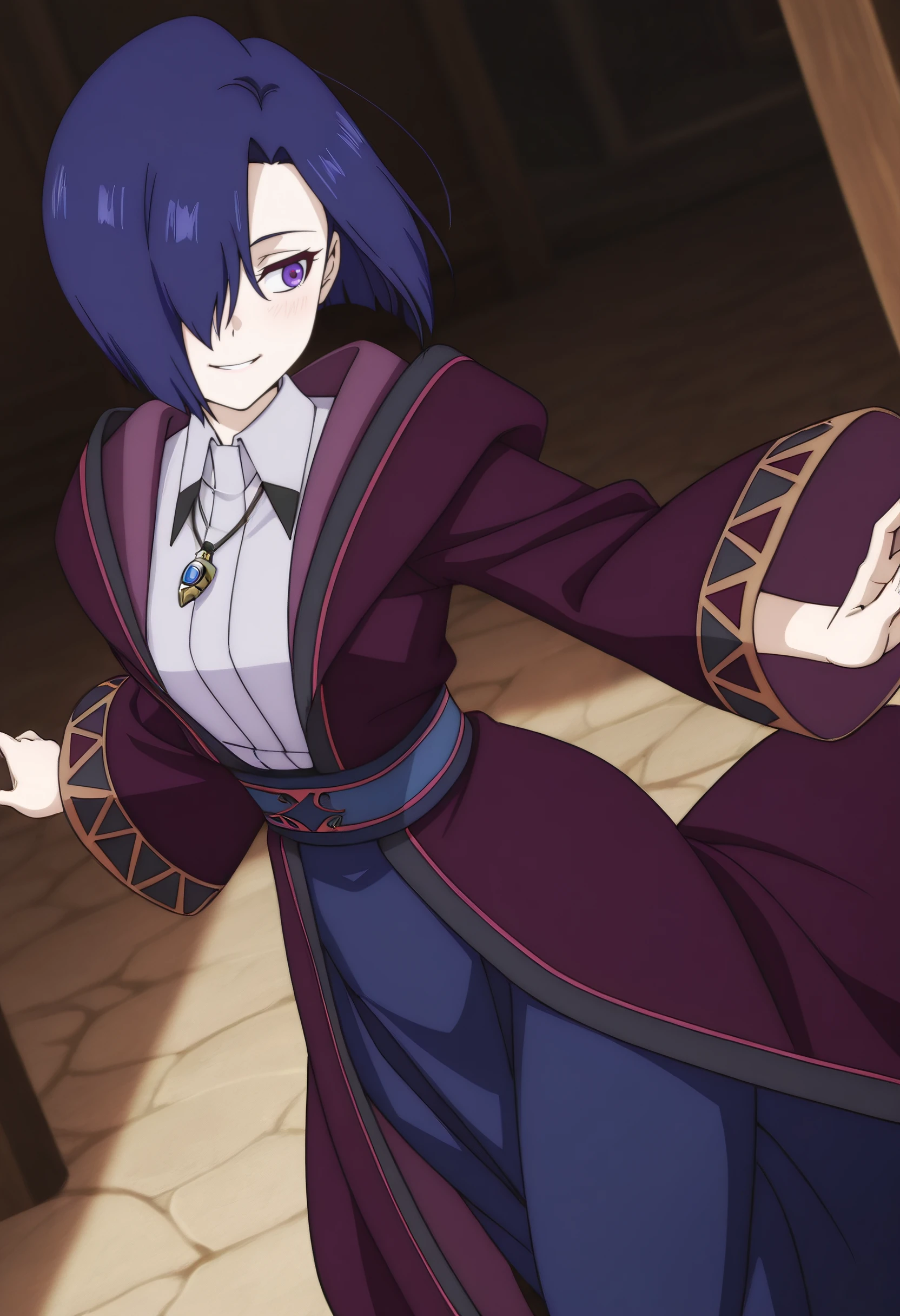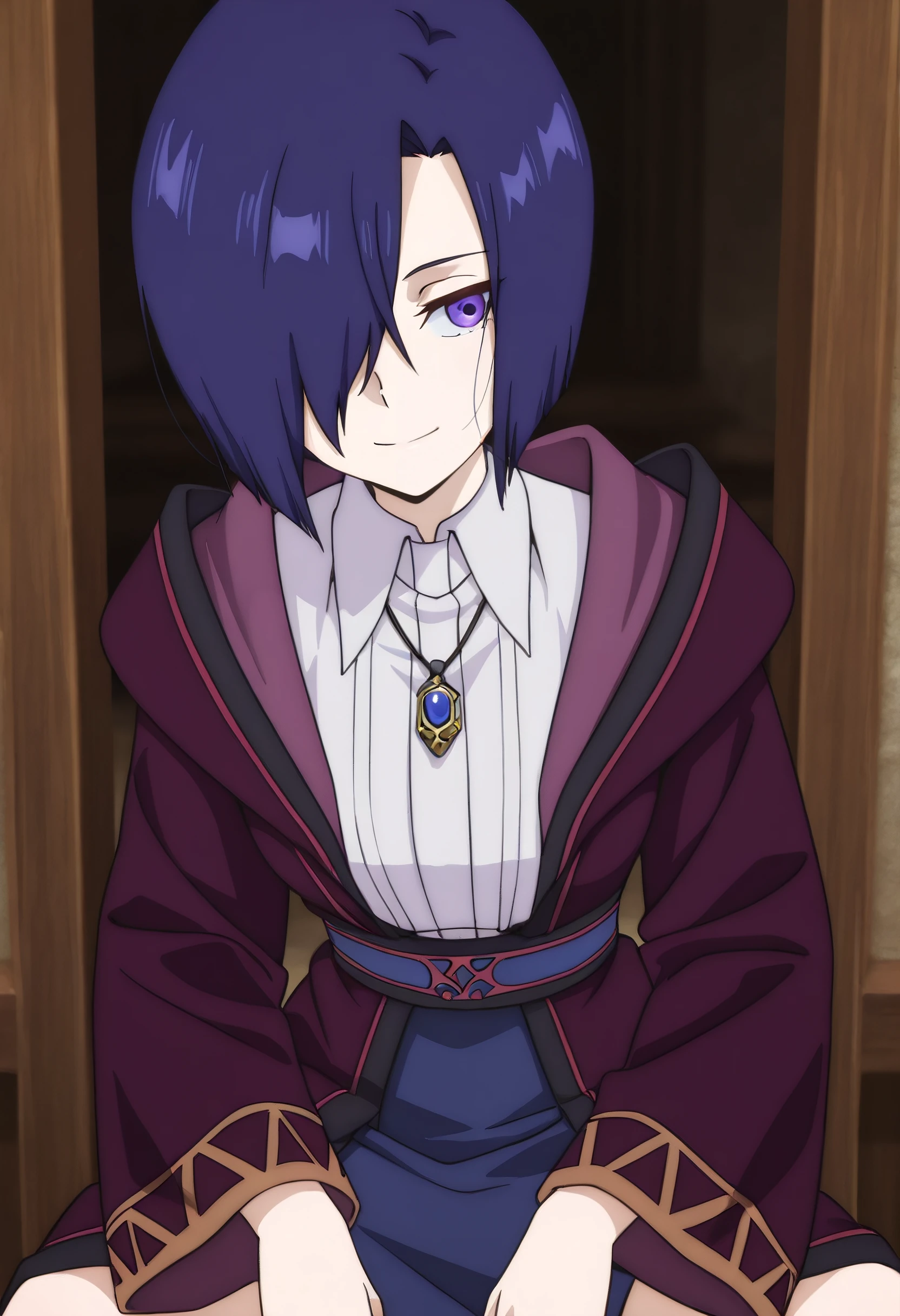 HelenaOutfit, shirt, collared shirt, robe, white shirt, jewelry, necklace, hood, long sleeves, hooded robe, wide sleeves, jacket, coat, open robe, hood down, skirt, purple robe, blue skirt,