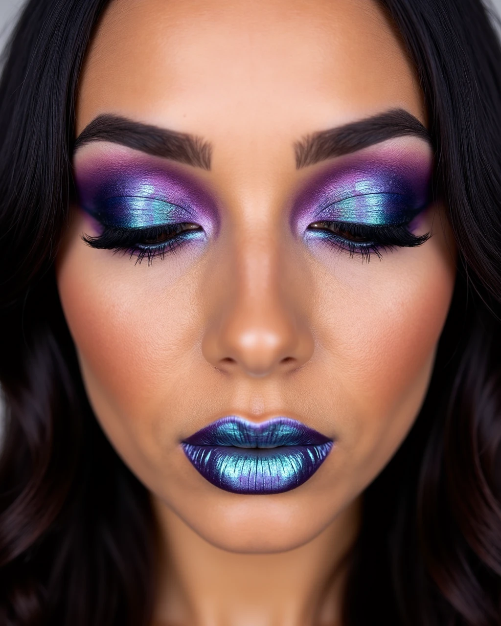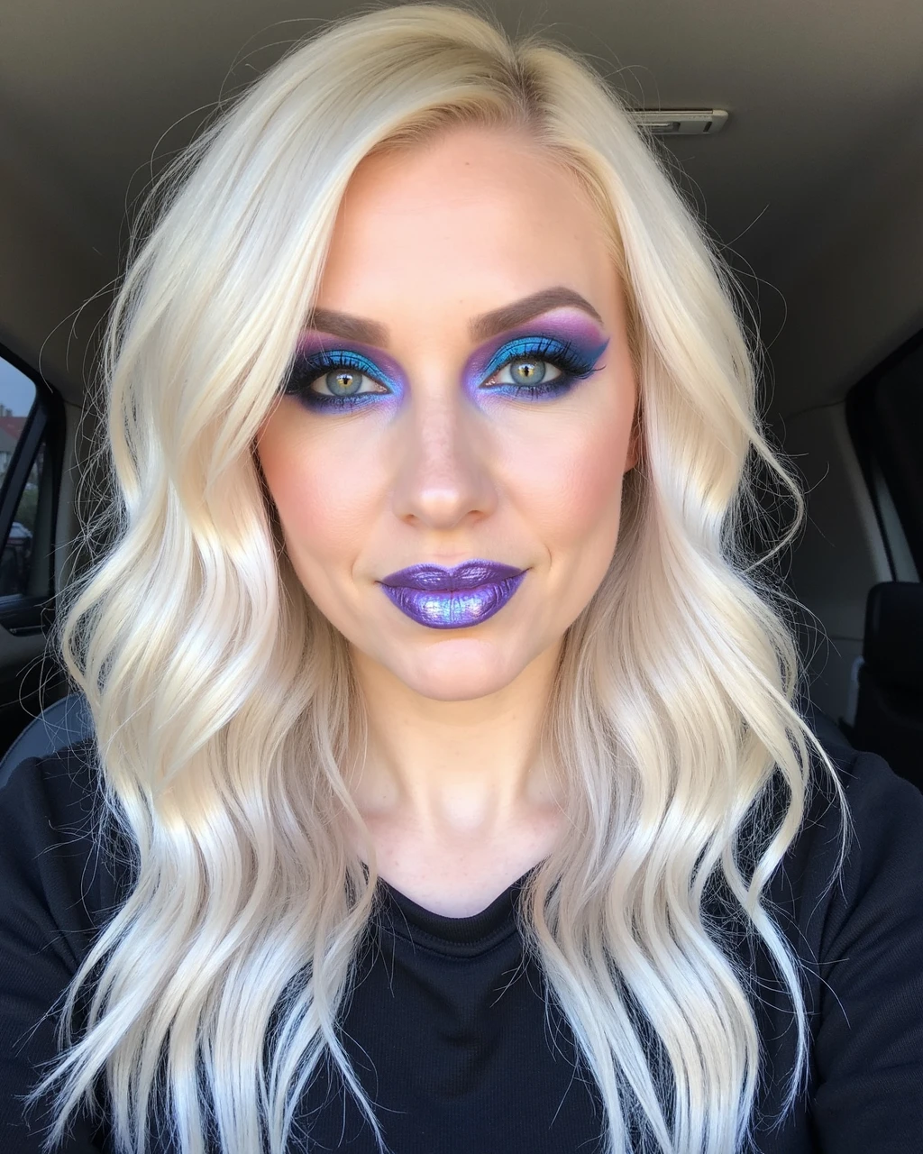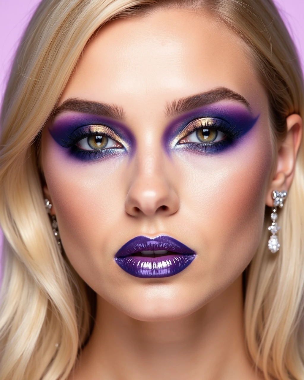 g4laxy, platinum blonde, dramatic galaxy eye makeup, violet chrome lipsg4laxy, extreme close-up eyes and lips, violet-to-teal galaxy smoky blend with dense star glitter, sharp wing liner, glossy chrome galaxy lips⚙️ Technical Stuff