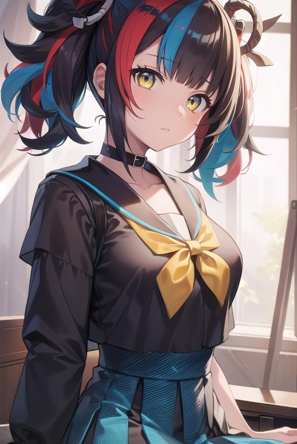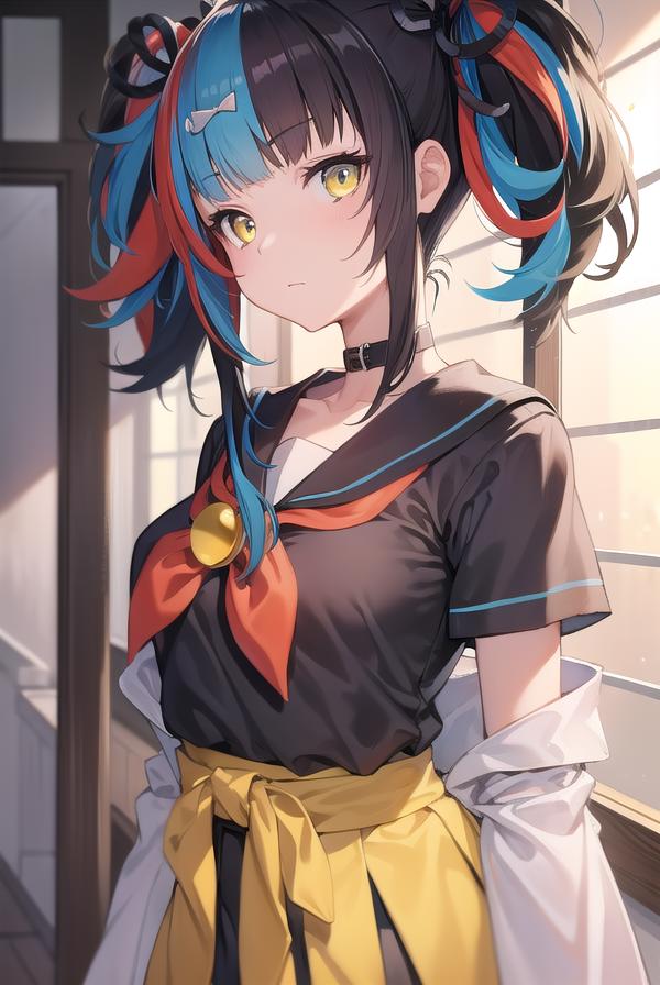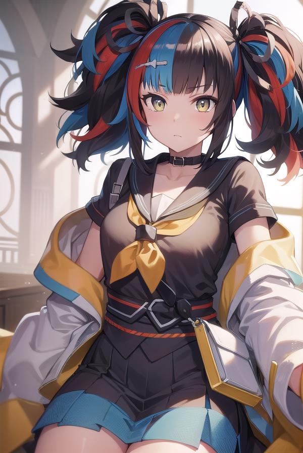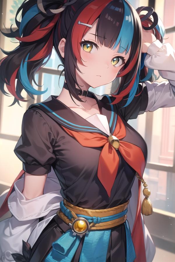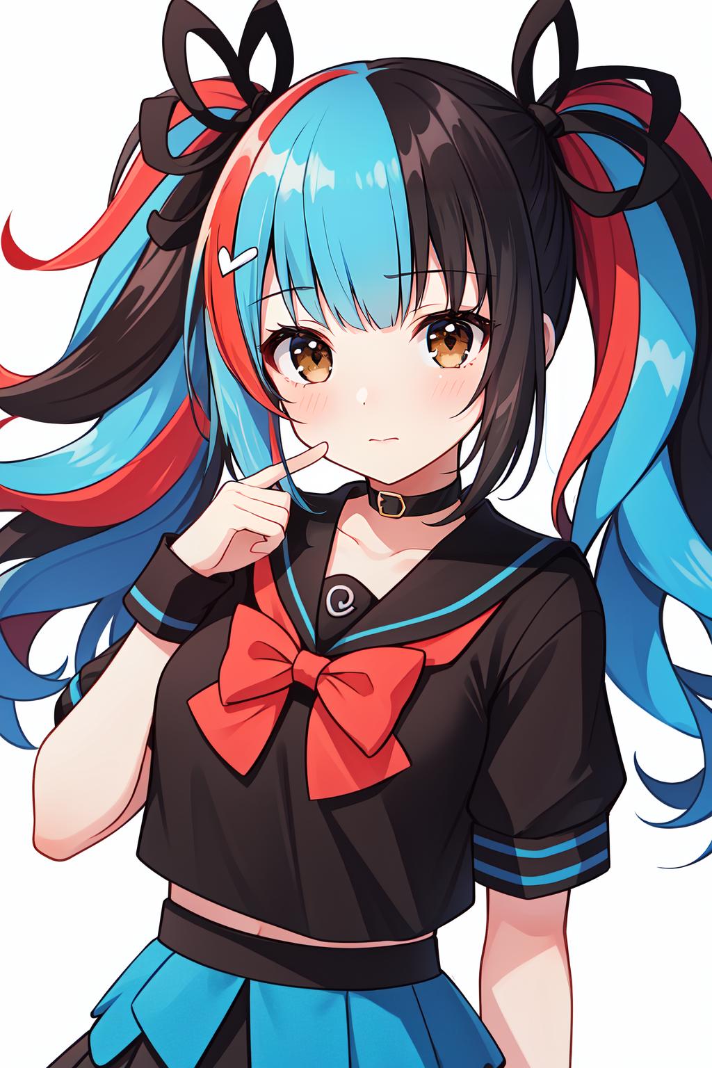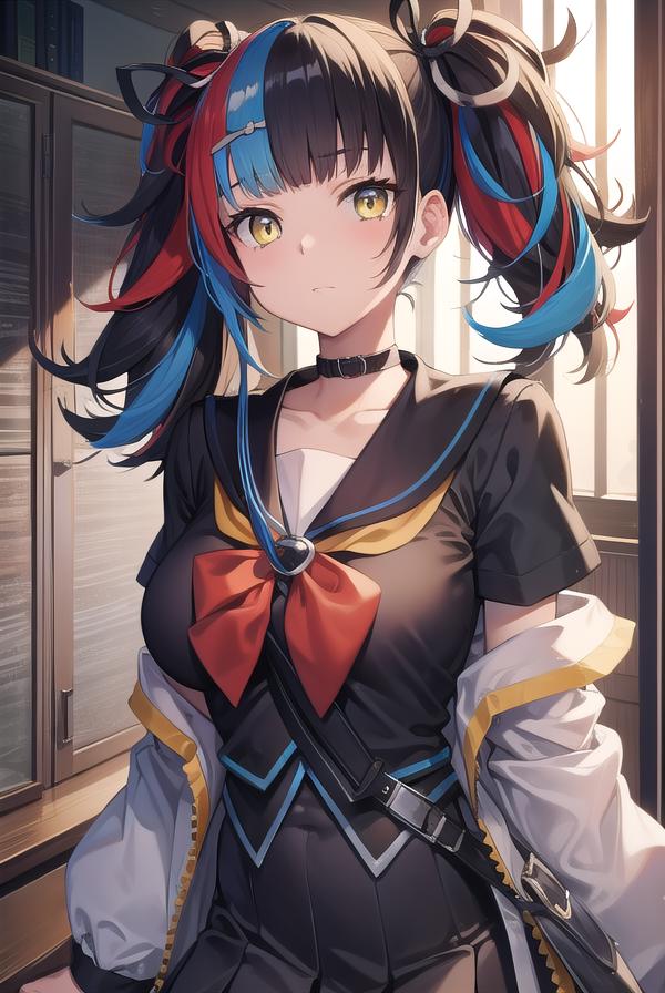sei shounagon, aqua hair, black hair, blunt bangs, multicolored hair, red hair, twintails, (brown eyes:1.5),