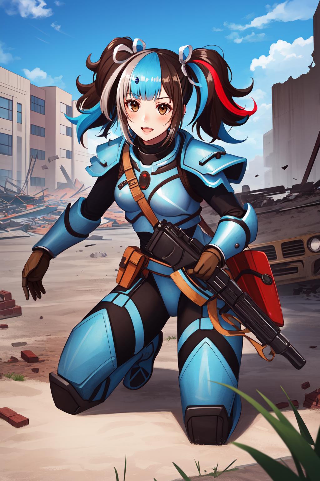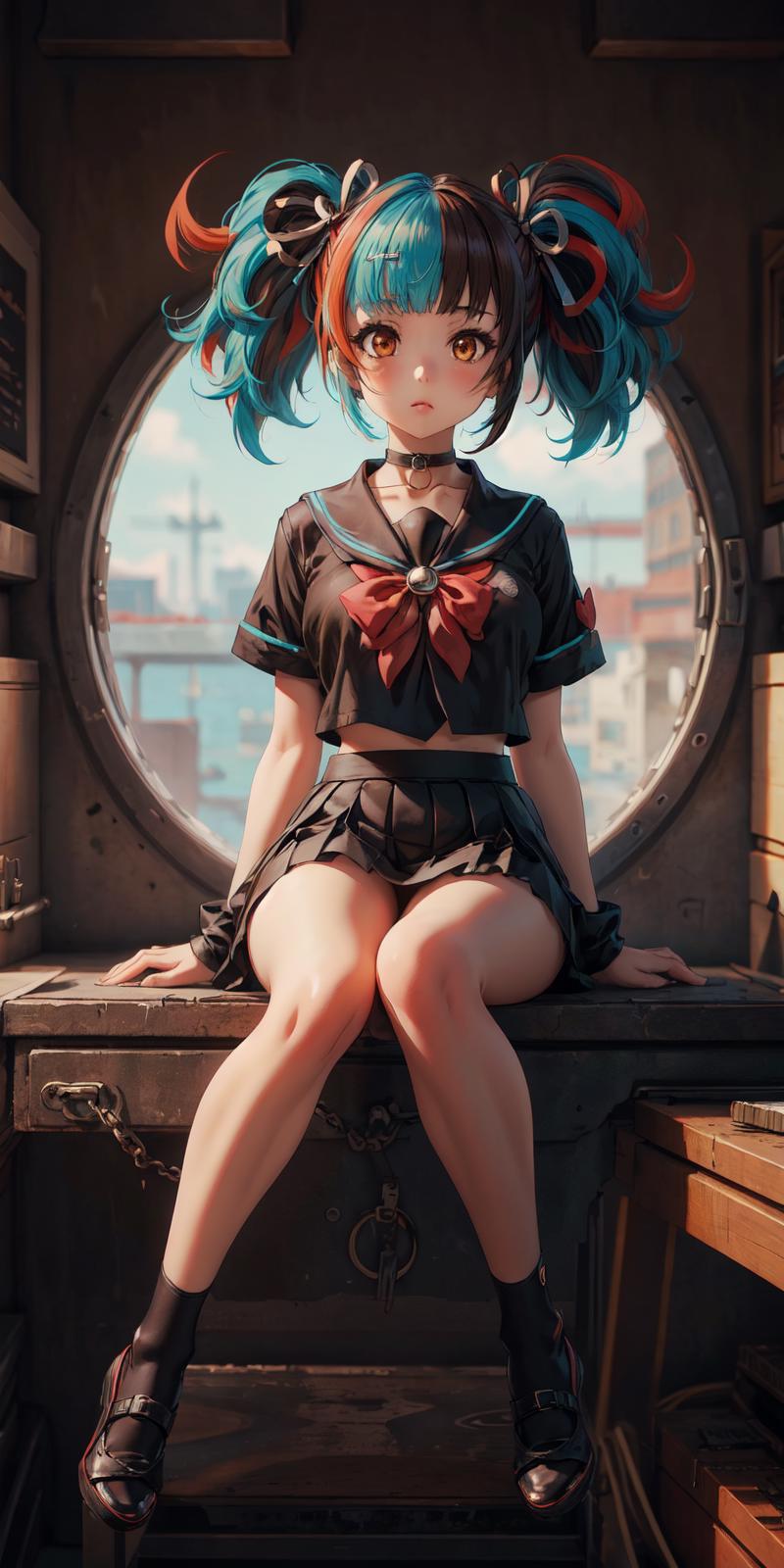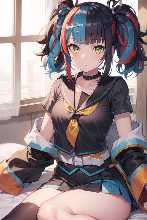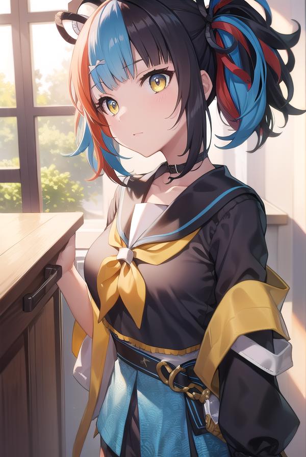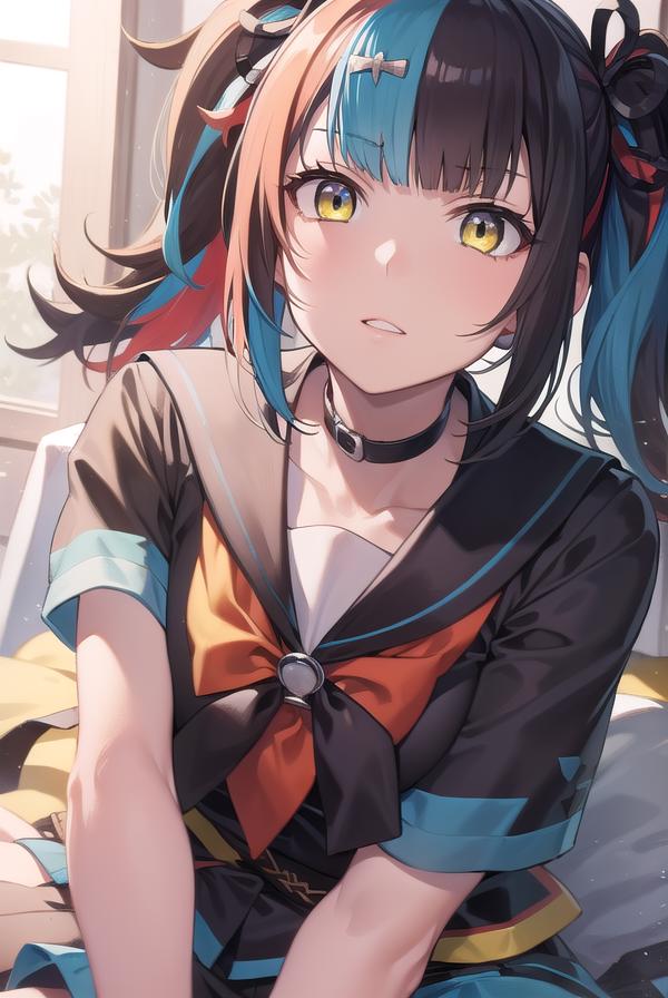 sei shounagon, aqua hair, black hair, blunt bangs, multicolored hair, red hair, twintails, (brown eyes:1.5),