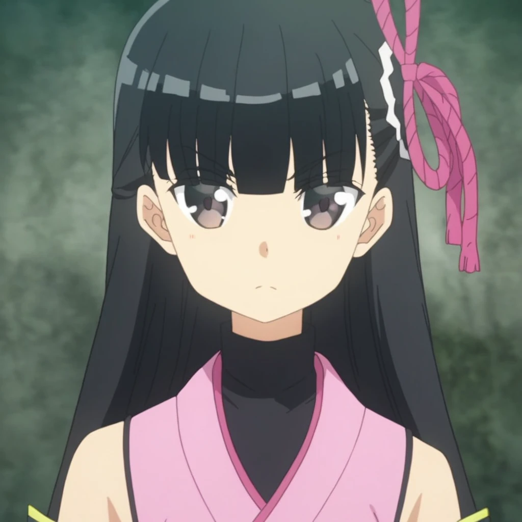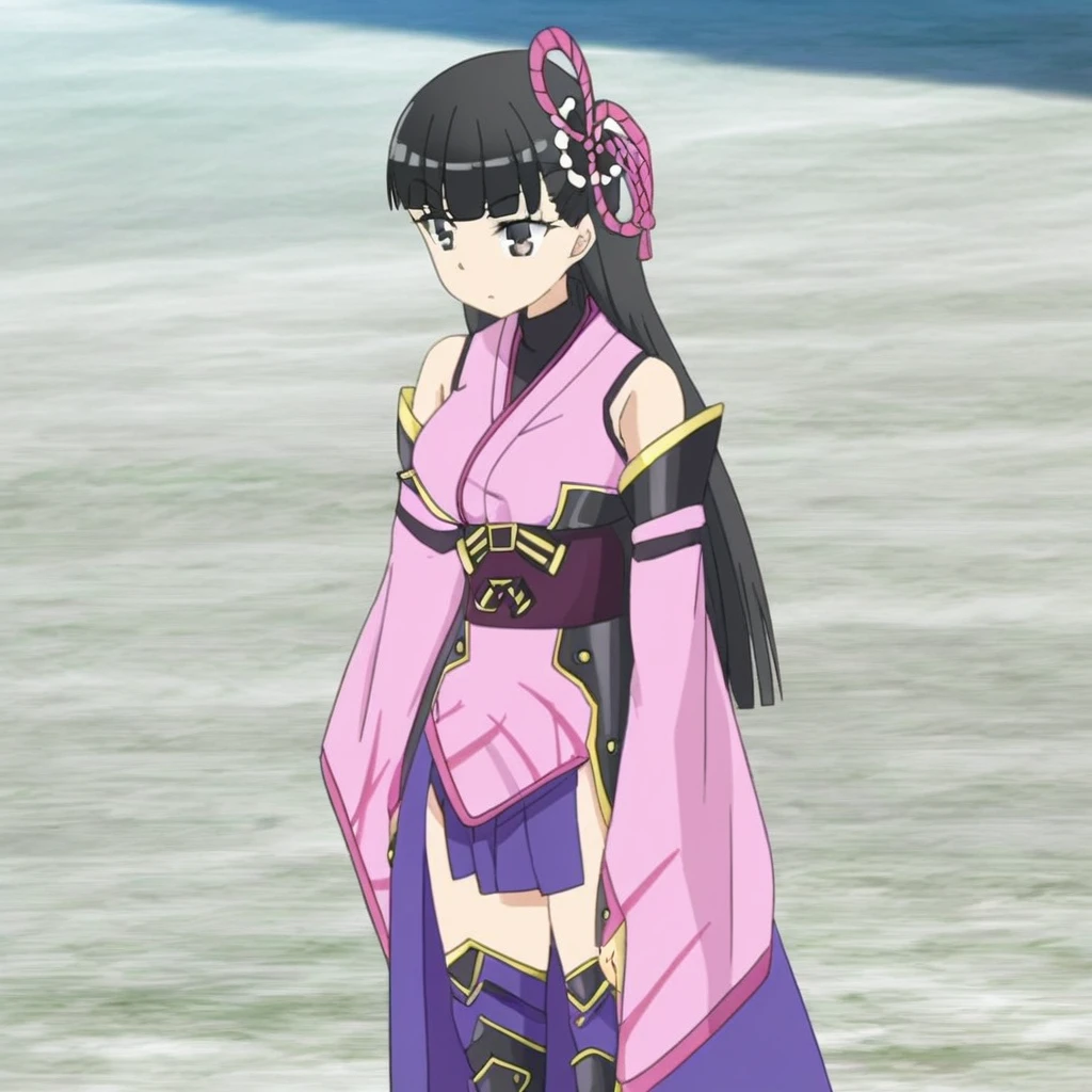Kasumi, grayish brown eyes, black hair, long hair, 1girl, solo, detached sleeves, japanese clothes, sheath, thighhighs, sheathed, pink kimono, hair ornament, blunt bangs, outdoors, skirt, breasts, purple hakama, wide sleeves, armor, kimono, standing, day, bare shoulders