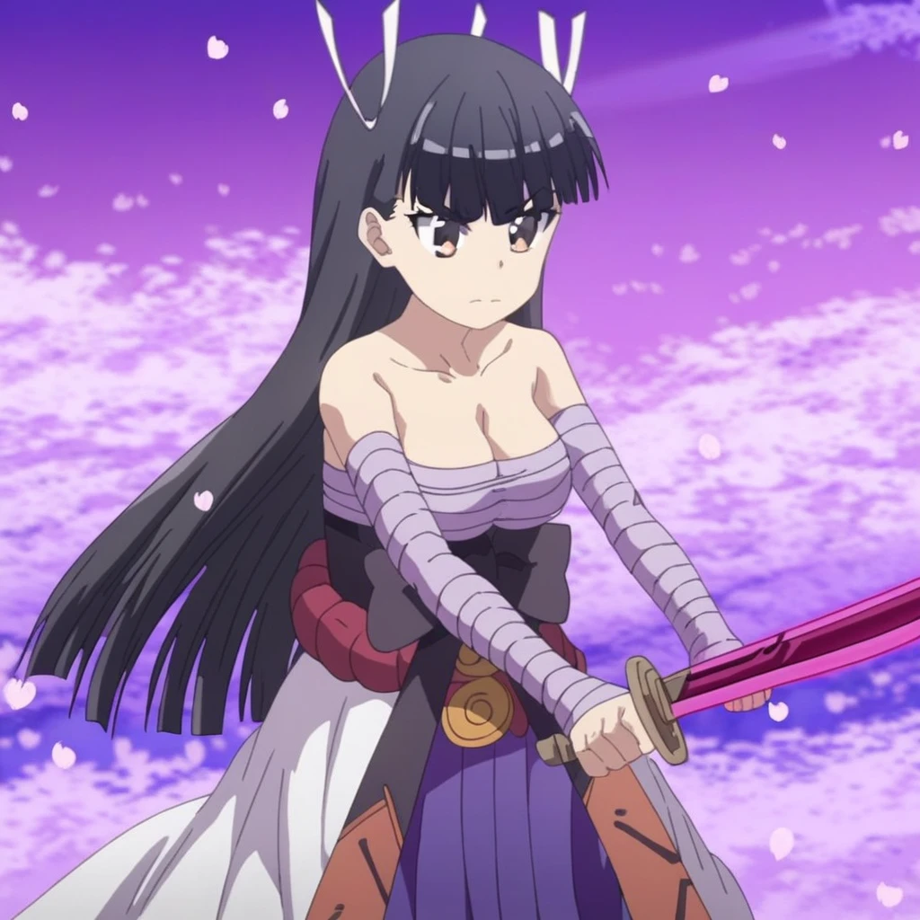 Kasumi, grayish brown eyes, black hair, long hair, 1girl, solo, breasts, sarashi, cherry blossoms, holding sword, holding, bandages, cleavage, petals, japanese clothes, skirt, bandaged arm, blunt bangs, collarbone, bare shoulders, medium breasts, closed mouth, outdoors, hakama