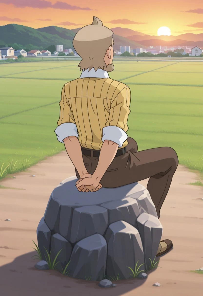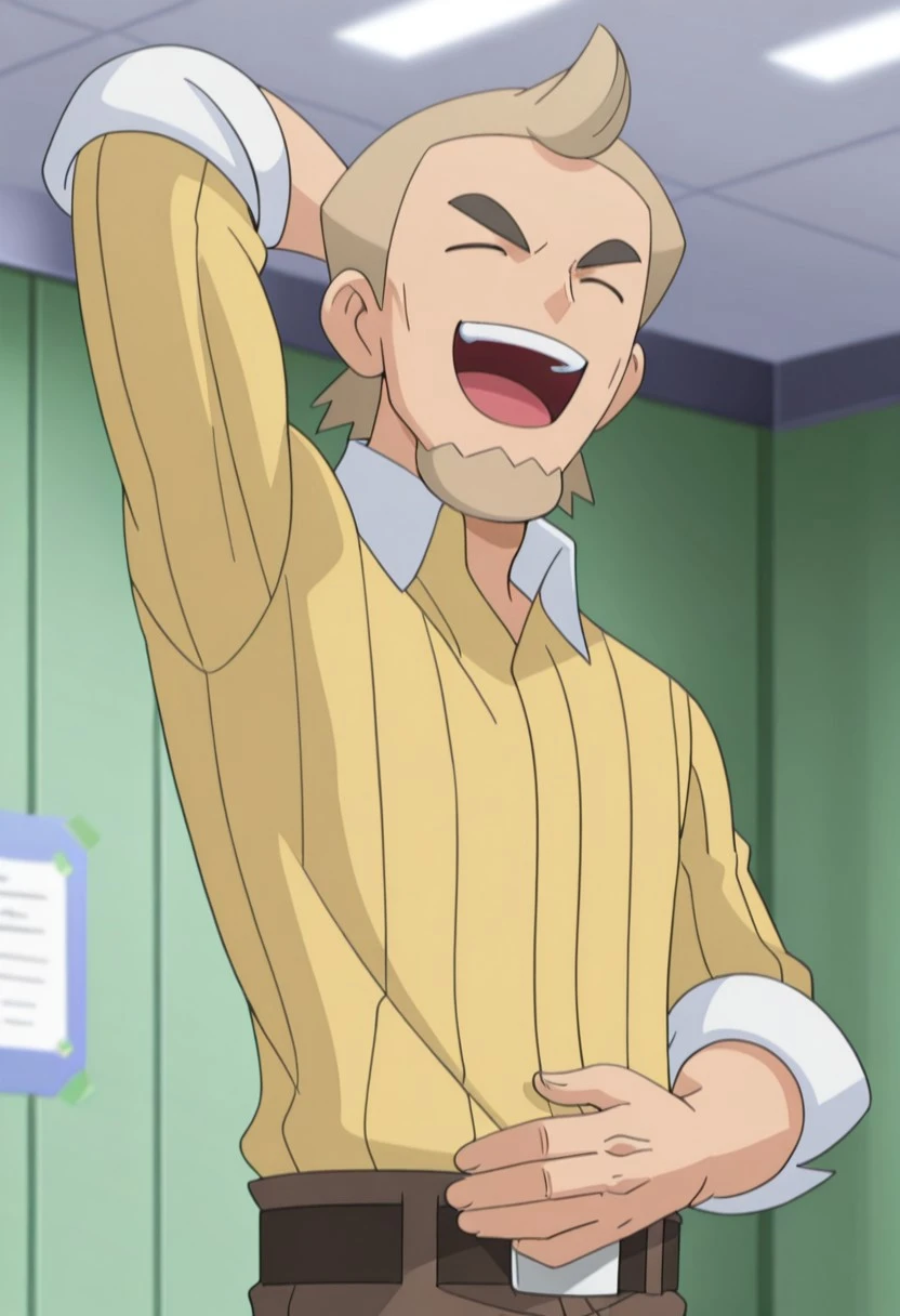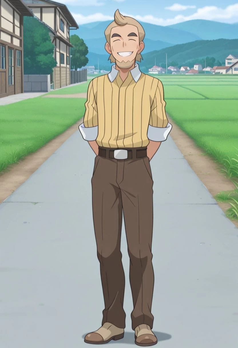 1boy, Cedric, facial hair, short hair, closed eyes, collared yellow shirt with vertical stripes, buckled belt, rolled up sleeves, brown pants, grey shoes
