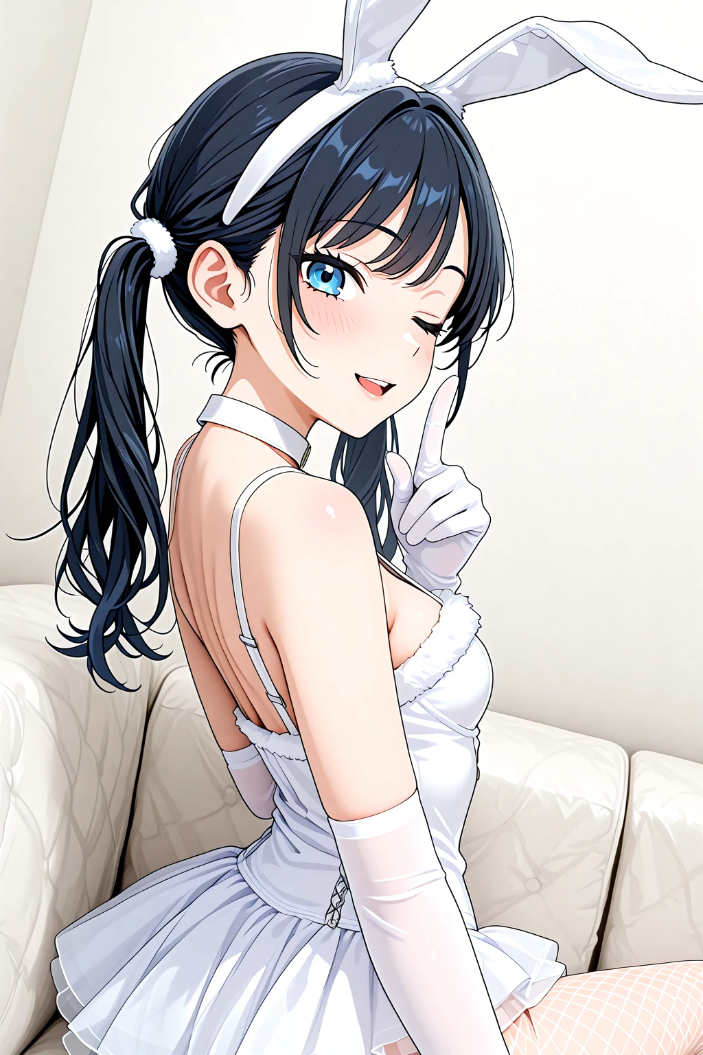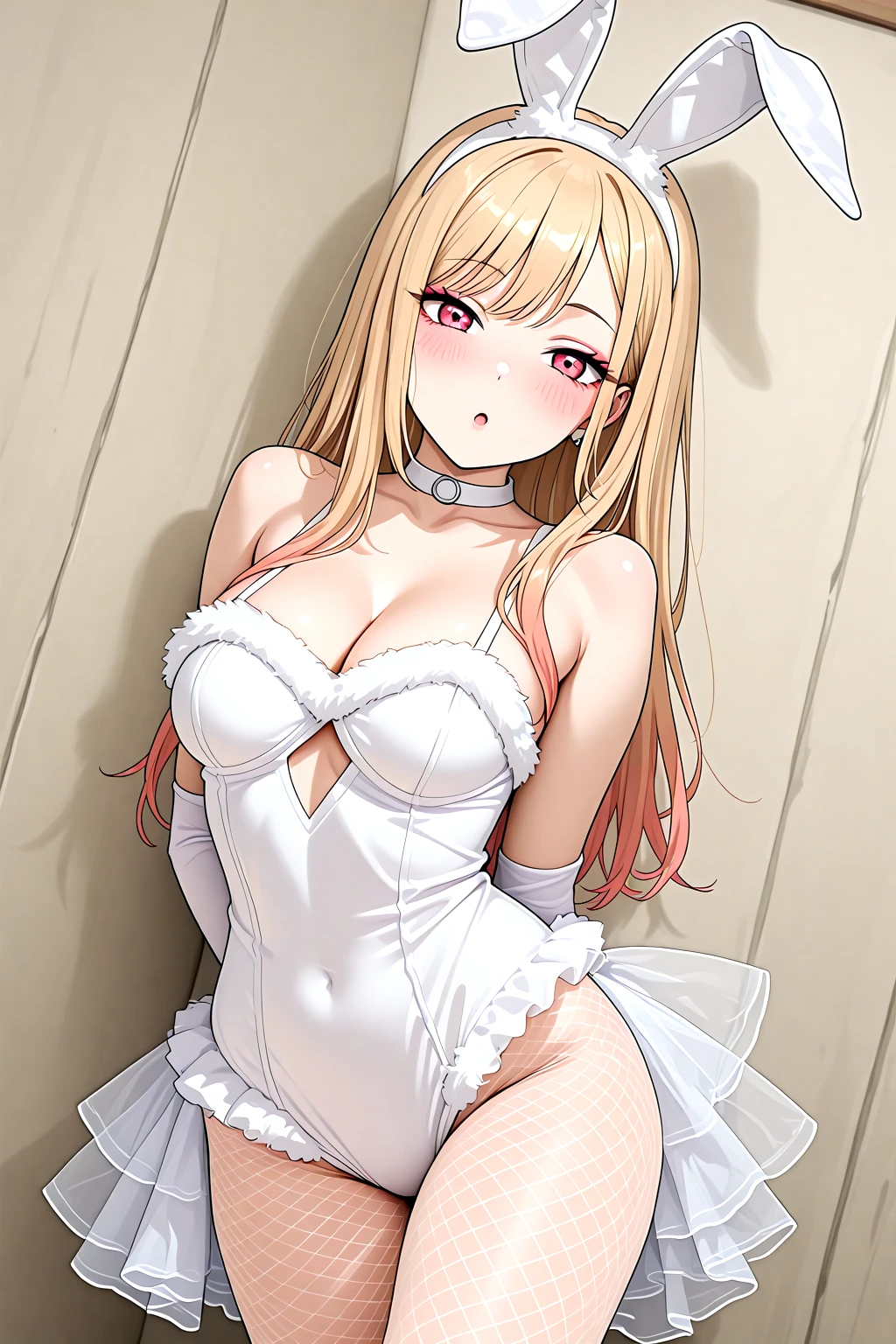 Bride_Bunny_Girl_Cos, fake animal ears, rabbit ears, playboy bunny, fur trim, skirt, back skirt, leotard, white leotard, bare shoulders, choker, fishnet pantyhose, white gloves, elbow gloves, cleavage, cleavage cutout, see-through