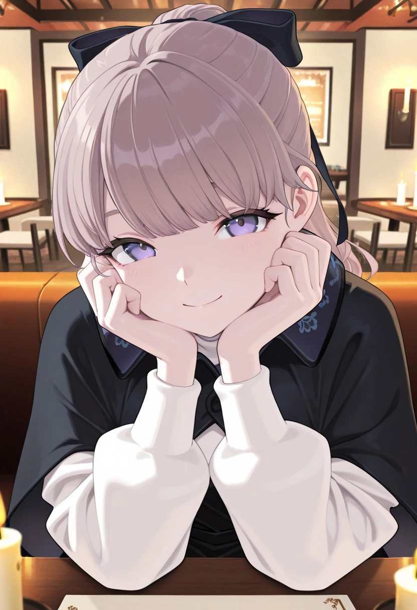 Appearance: light brown hair, purple eyes, ponytail, bangs, hair bow, black capelet, black dress, white sweater, red socks, knee highs, black shoes,