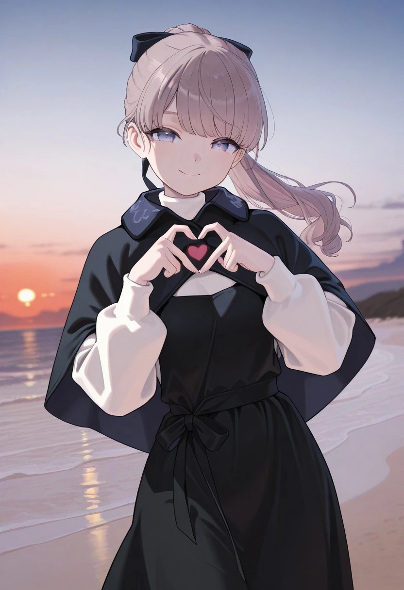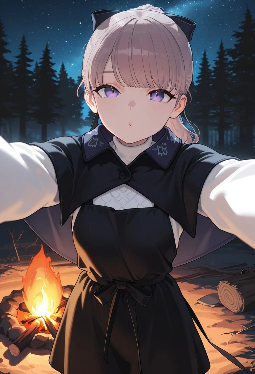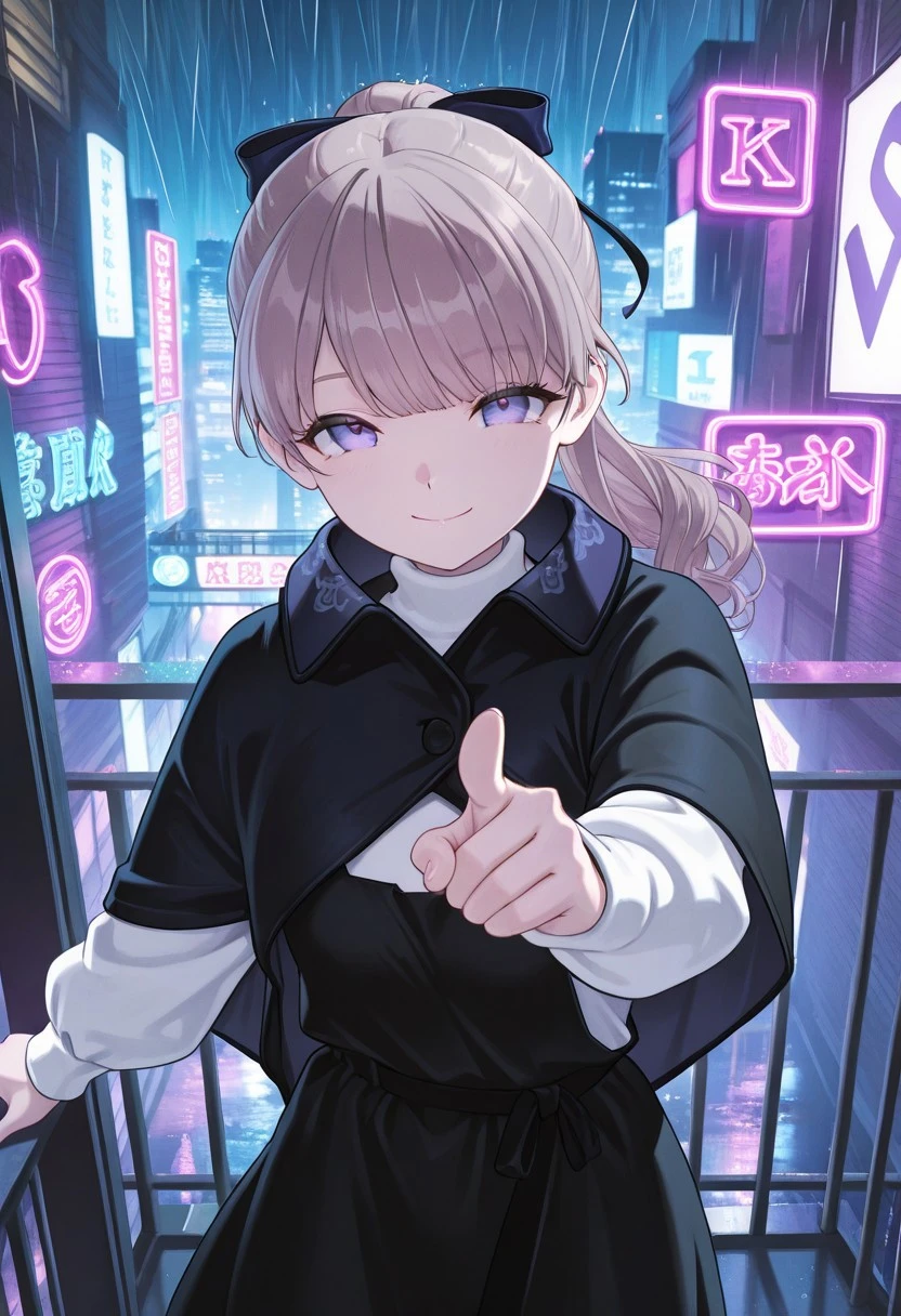 light brown hair, purple eyes, ponytail, bangs, hair bow, black capelet, black dress, white sweater, red socks, knee highs, black shoes,