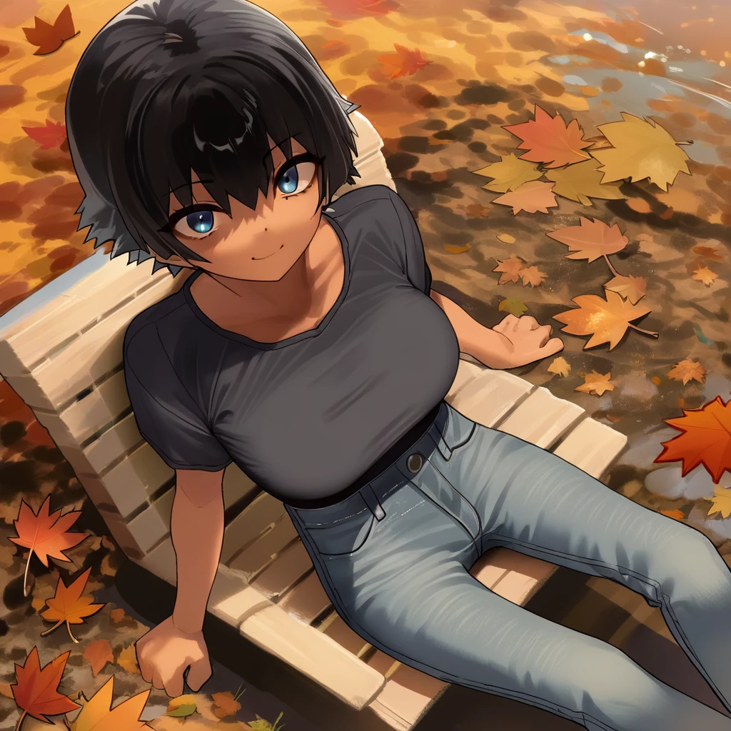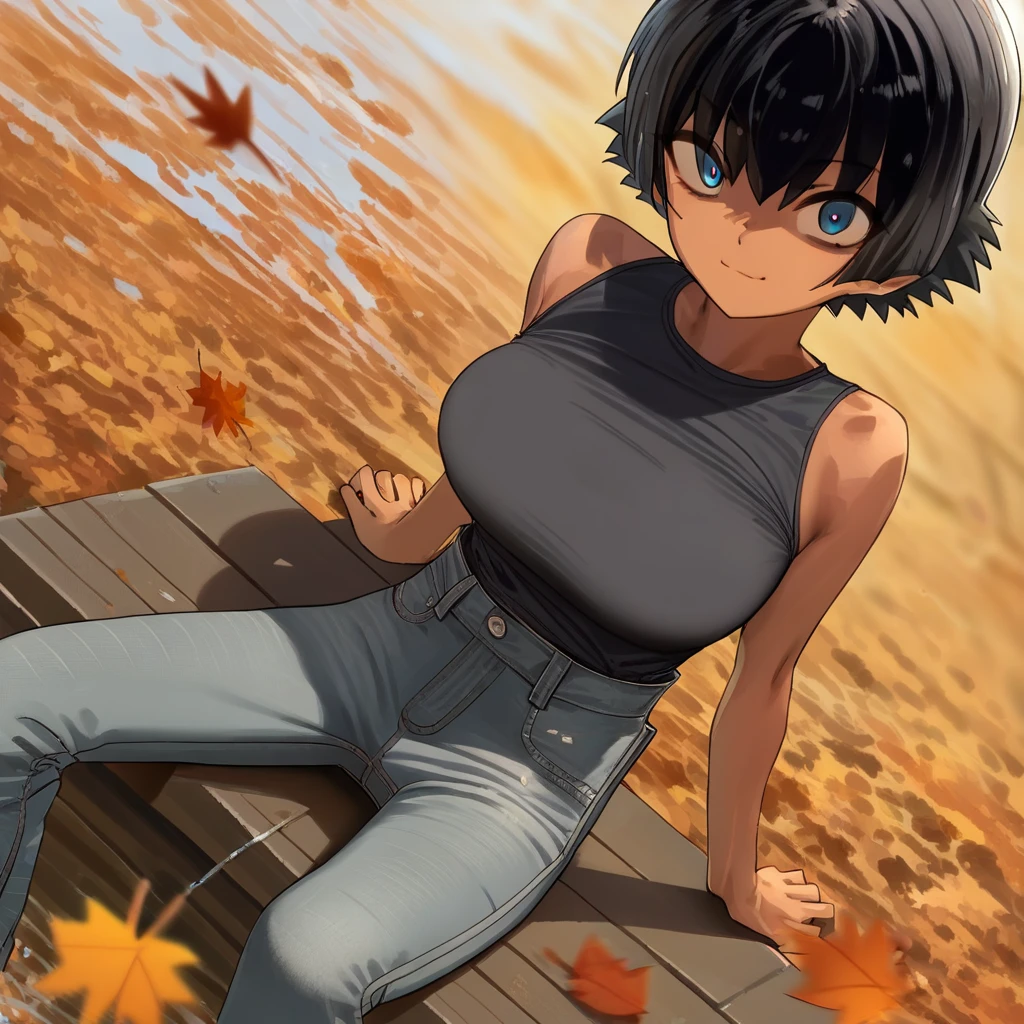 sasaki_hotaru: beautiful blue eyes, beautiful black hair, beautiful short bob haircut, bangs, huge and shaggy breasts, busty woman, beautiful lightly tanned skin,