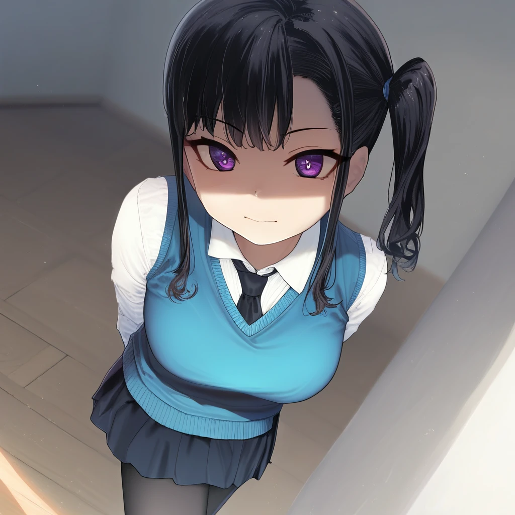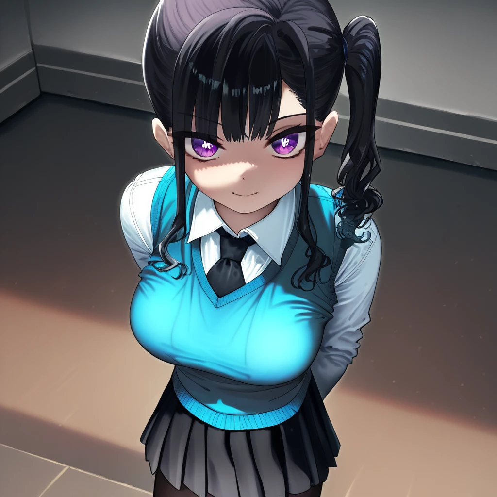 sasaki_kanna: beautiful red eyes, beautiful black hair, short twintails, bangs, left side ponytail, thin waist, wide hips, beautiful skin, huge and shaggy breasts, short busty woman,