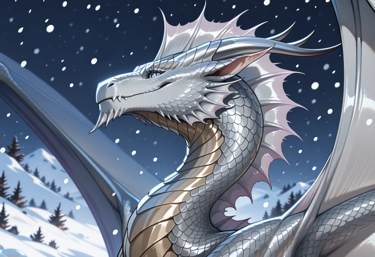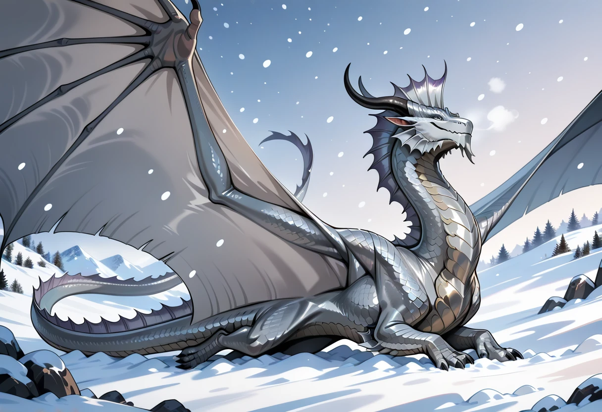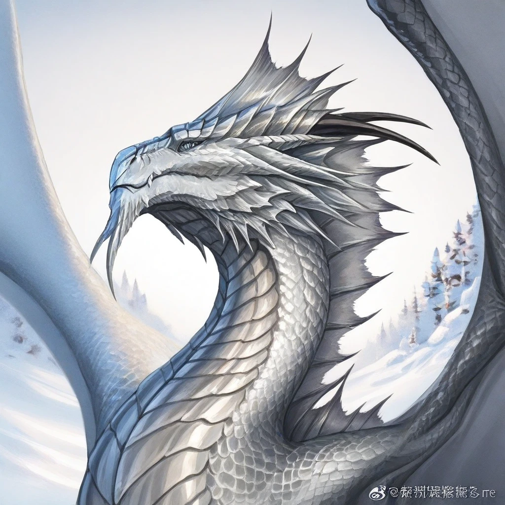 dragon, silver scales, long tail, long neck, head crests, large neck crest, huge wings, claws, horns