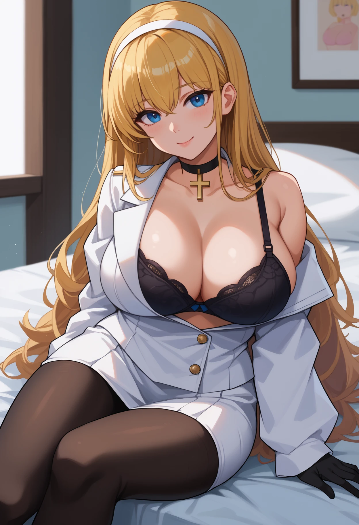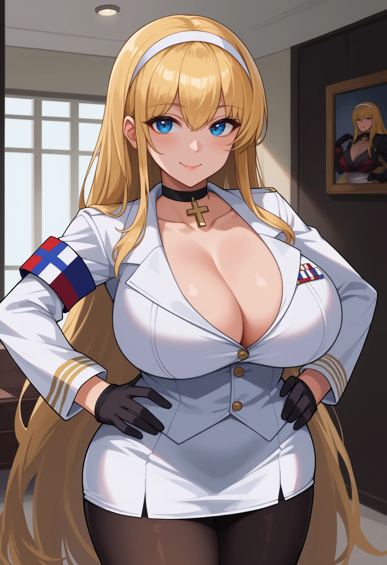jelonhcadef, large breasts, blue eyes, blonde hair, hair between eyes, long hair, white hairband, cross choker, white jacket, long sleeves, armband, black half gloves, bra peek, pencil skirt, white skirt, black pantyhose, cleavage