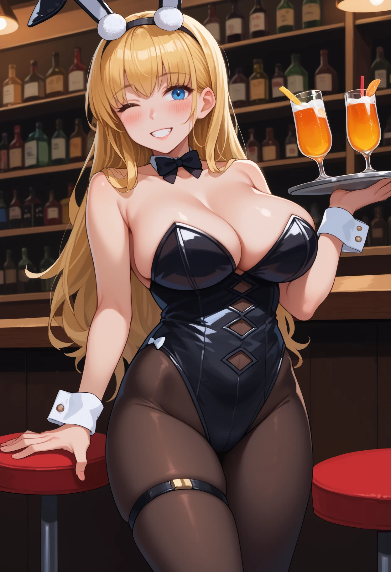 jelonhcathd, large breasts, blue eyes, blonde hair, hair between eyes, long hair, white bow, thigh strap, black hairband, fake animal ears, detached collar, black bowtie, black leotard, stomach cutout, wrist cuffs, brown pantyhose