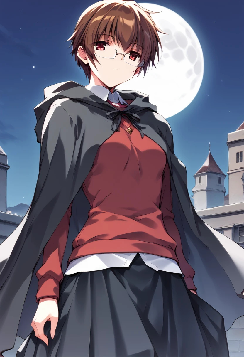 square shaped glasses, cloak, red sweater, long sleeves sweater, collared shirt, long skirt
