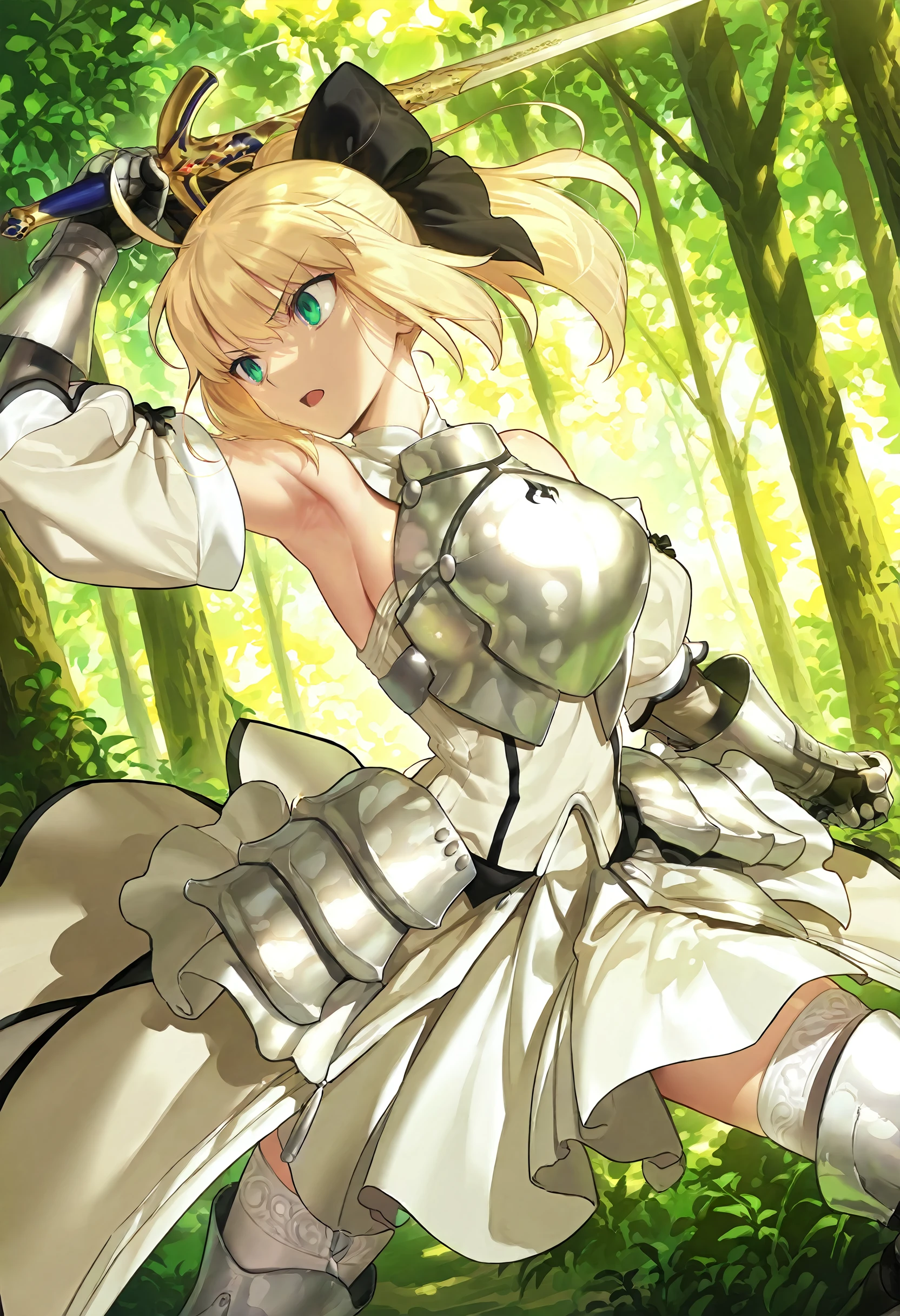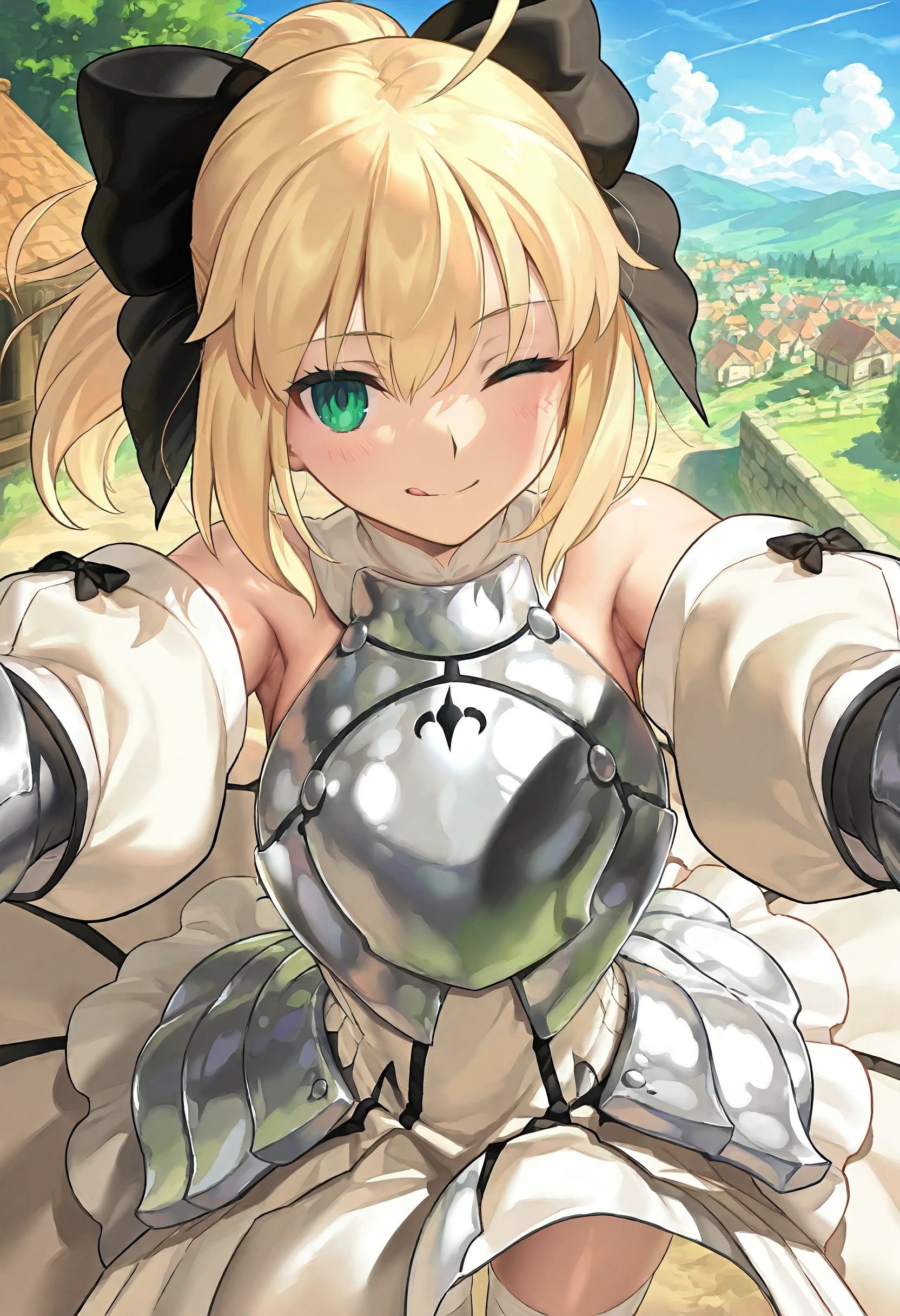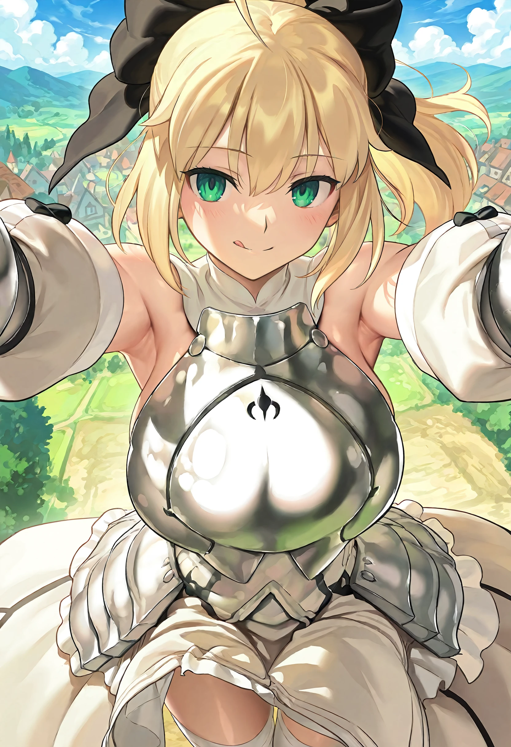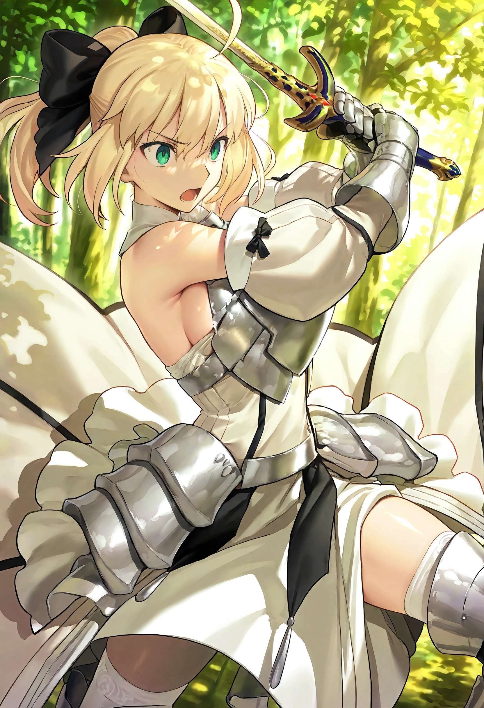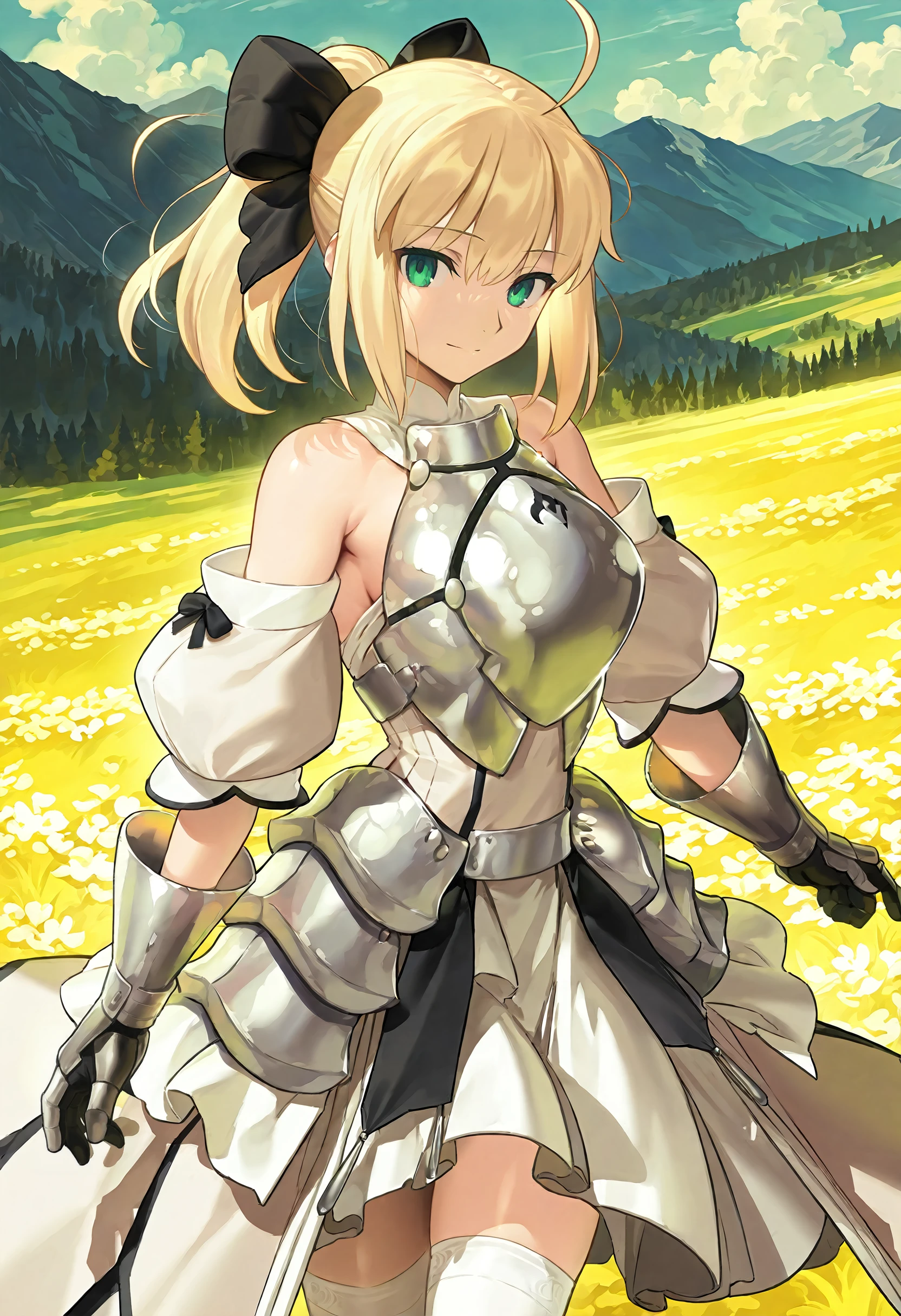 saber lily, artoria pendragon (fate), blonde hair, ahoge, green eyes, ponytail, hair bow, black bow