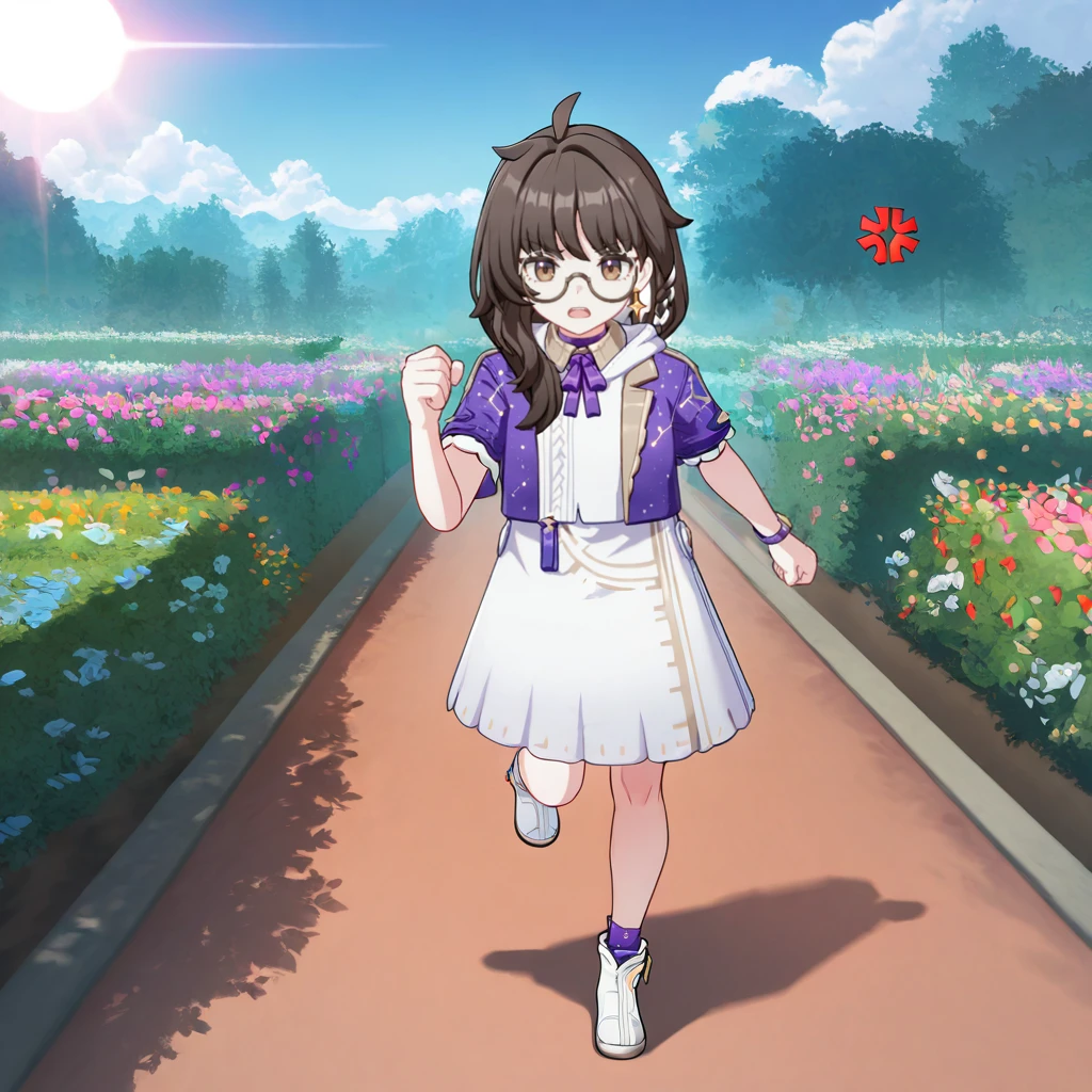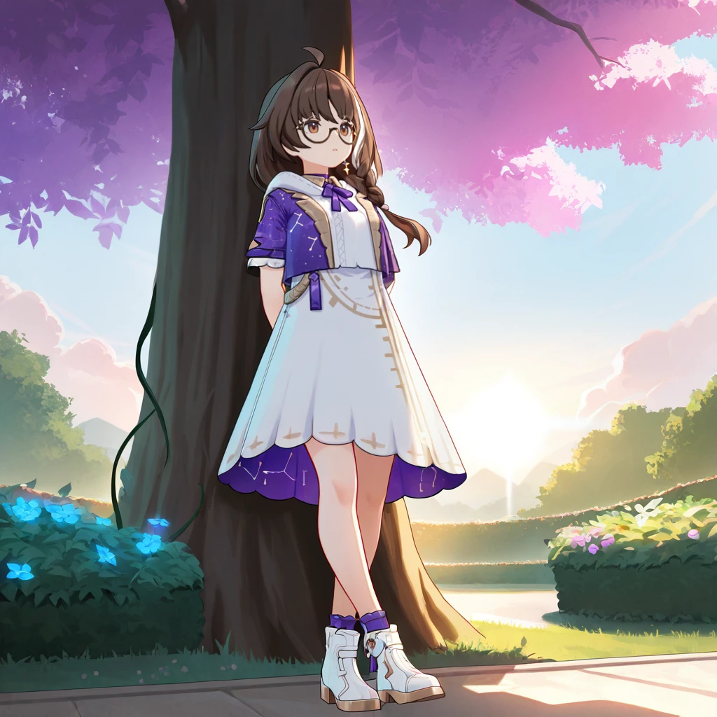 LeylahHi3, brown hair, long hair, hair over shoulder, white streaks, streaked hair, brown eyes, two-tone eyes, white skirt, high-waist skirt, light brown trim, cropped jacket, purple jacket, constellation print, under-rim eyewear, round eyewear, glasses, single earring, braid, purple sleeves, short sleeves, purple bracelet, cropped hoodie, white hoodie, purple ribbon, neck ribbon, collared collar, light brown collar, purple choker, layered clothes, medium skirt, white footwear, ankle boots, purple socks,The results of your generations are dependent on the additional LoRAs, weights, and models you use, so it may not work or come out as consistent as my sample images.