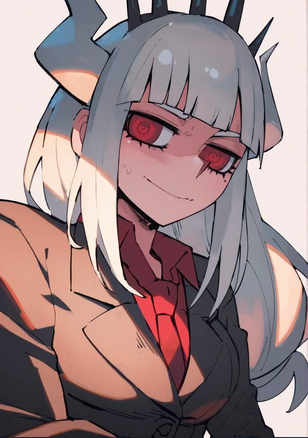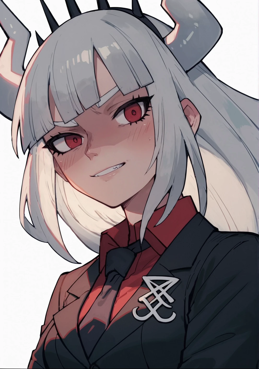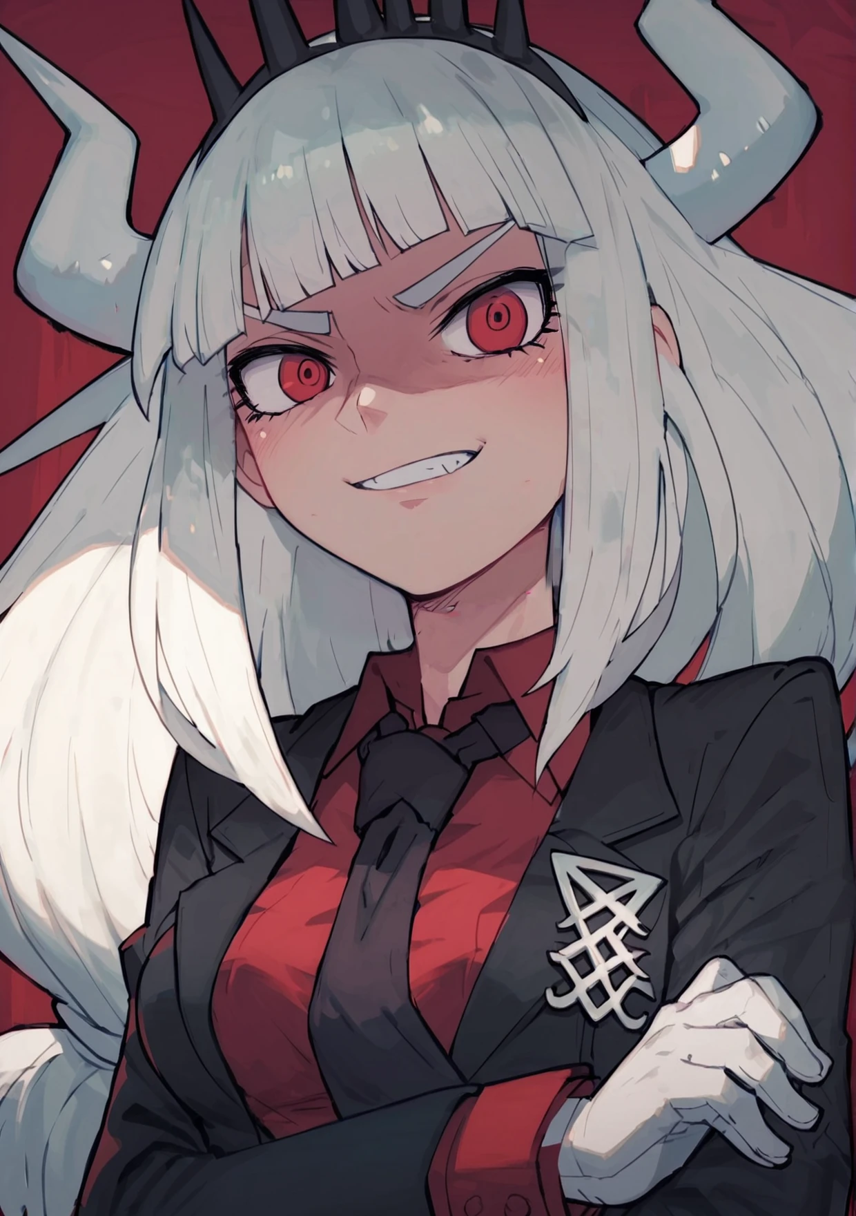 1girl, lucifer (helltaker), horns, white hair, long hair, blunt bangs, red eyes, red shirt, formal, necktie
