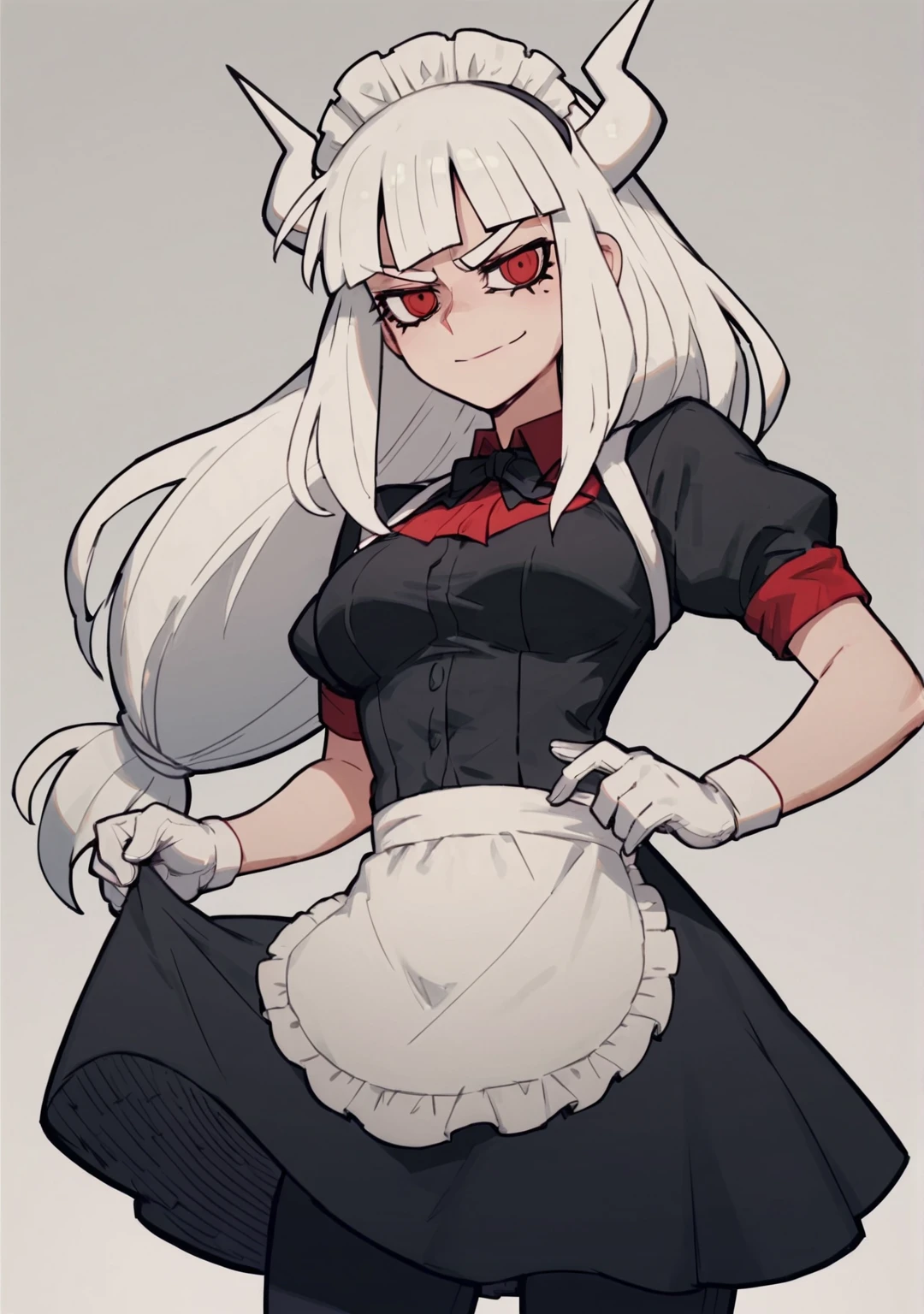 Lucifer is the eighth demon encountered in Helltaker. She takes the role as the queen of Hell, and has the same title- "CEO of Hell." In Examtaker, which takes place much later on after the base game, Lucifer serves as a maid under Loremaster, having been usurped by her as the ruler of Hell. She is 9100 Years old.