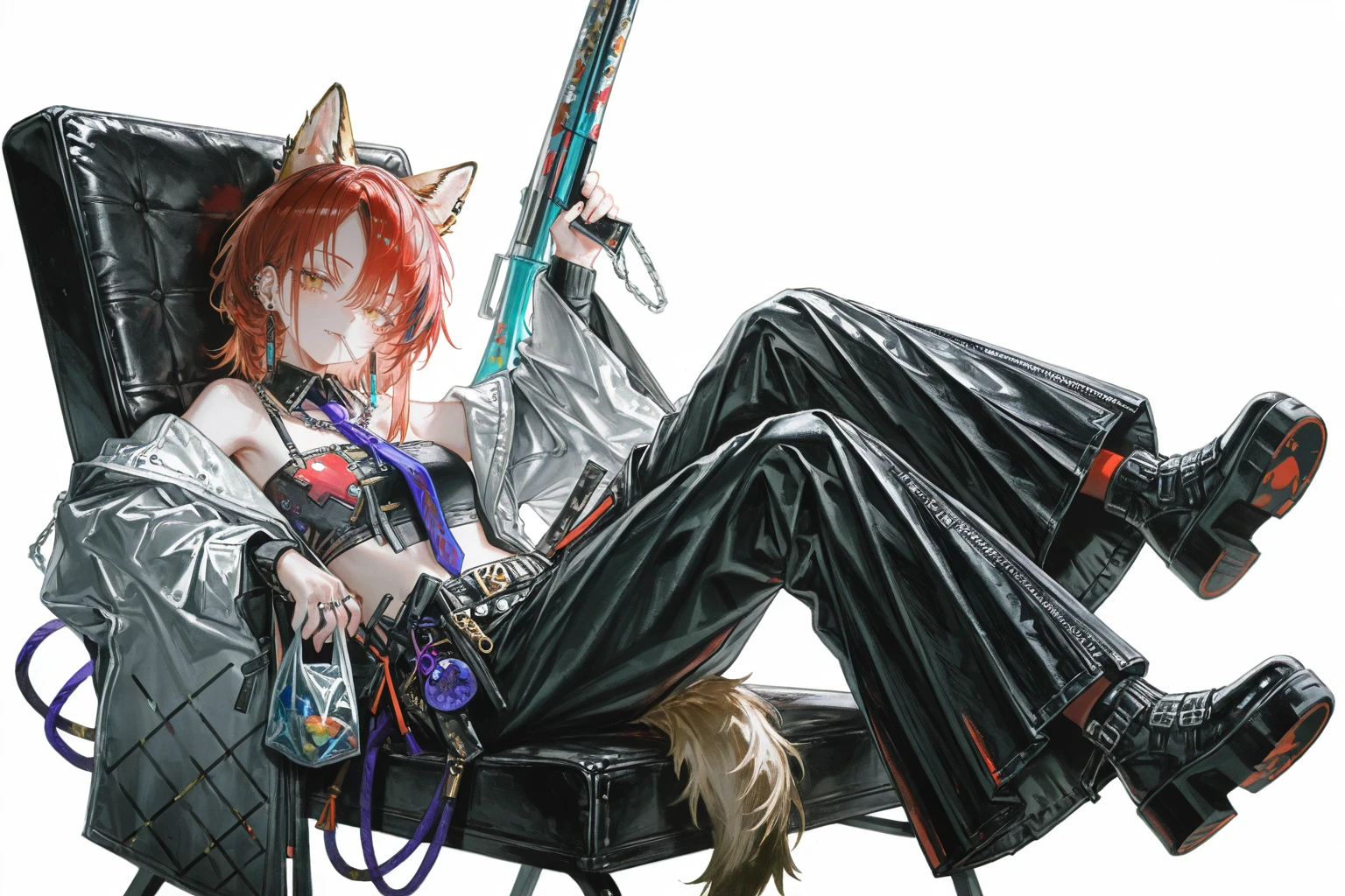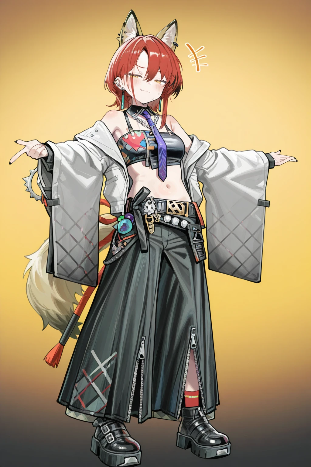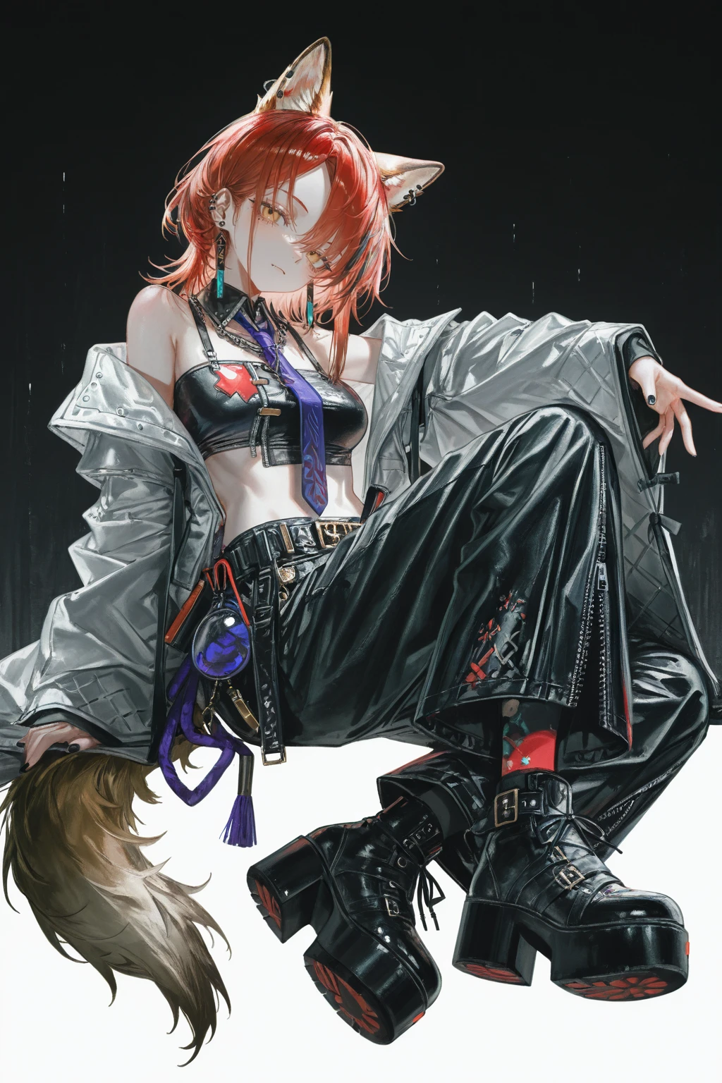 kichisei_\(arknights\),1girl,solo,dog ears,animal ear piercing,red hair,medium hair,parted bangs,yellow eyes,dog tail,ear piercing,earrings,bare shoulders,chain necklace,purple necktie,detached collar,white jacket,,wide sleeves,black tube top,shimenawa,black belt,belt pouch,black pants,unzipped,mismatched socks,platform footwear,