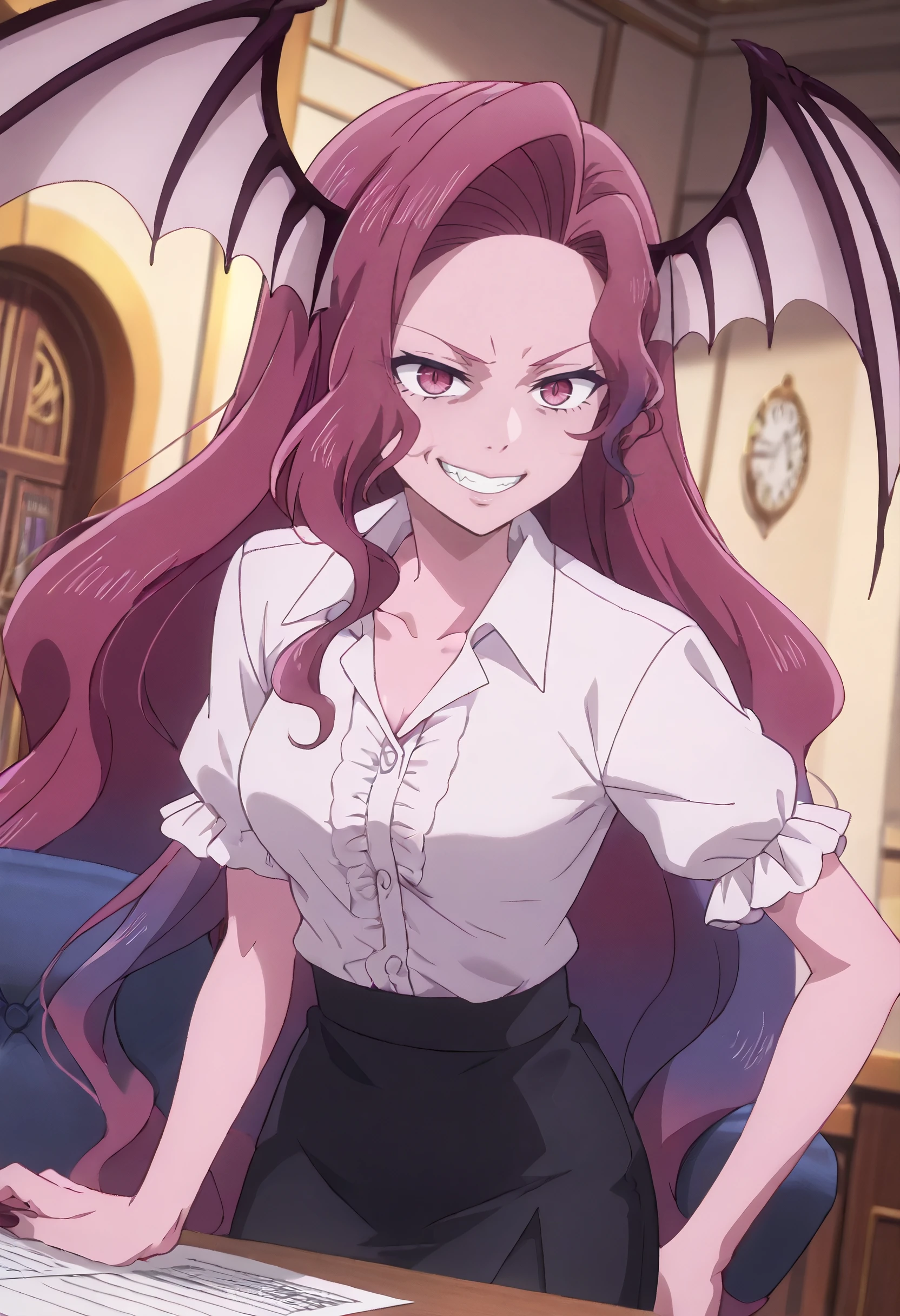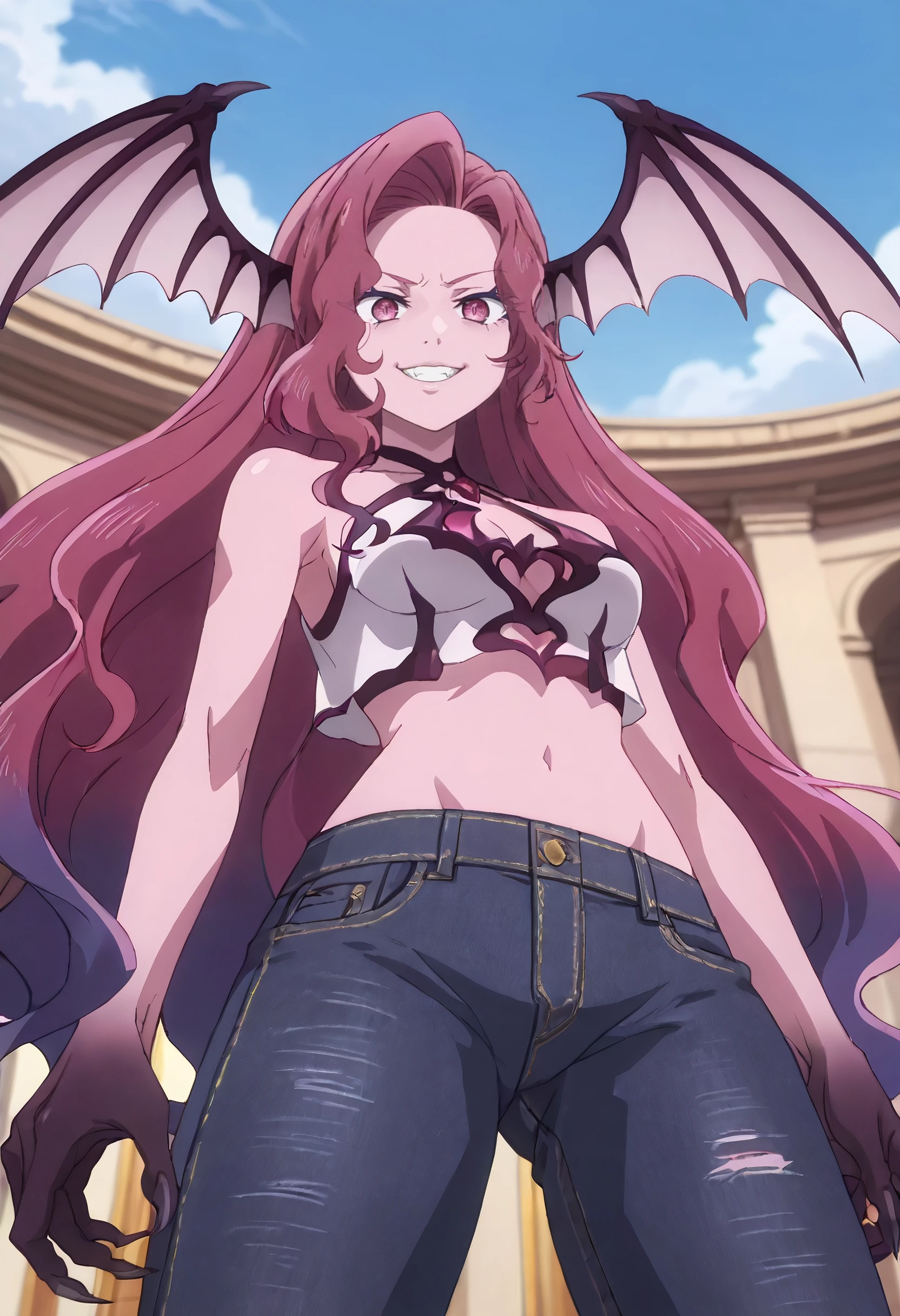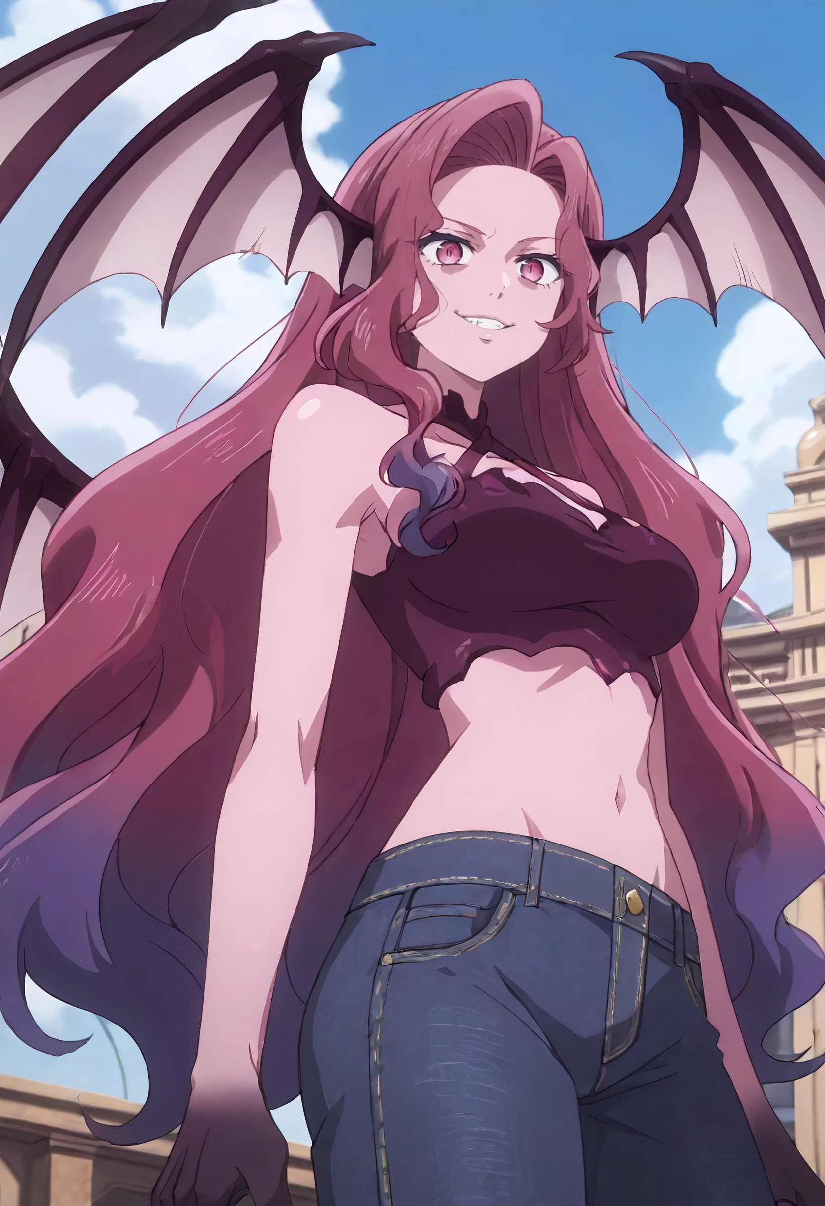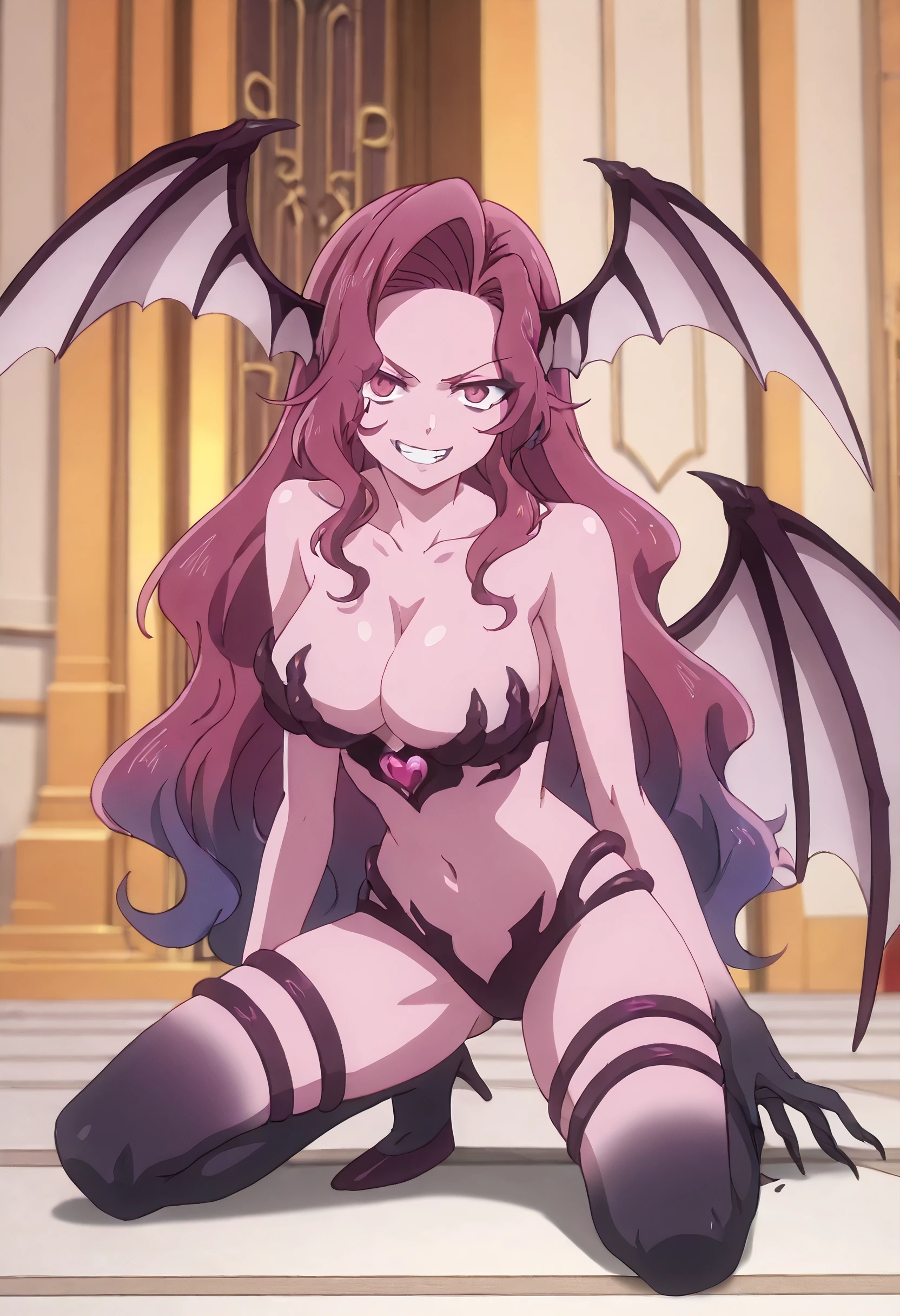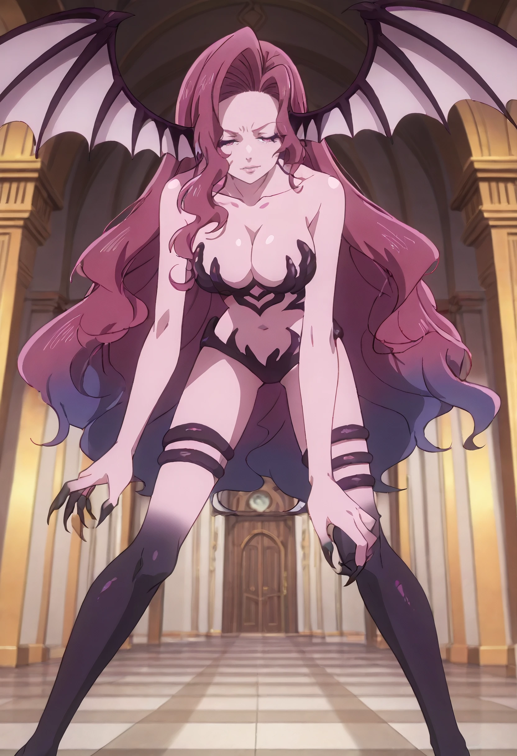 KYTYulia, long hair, pink hair, demon girl, monster girl, pink eyes, very long hair, gradient hair, multicolored hair, purple hair, hair intakes, wavy hair, wings, head wings, demon wings, colored skin, purple skin, claws, low wings, multiple wings,