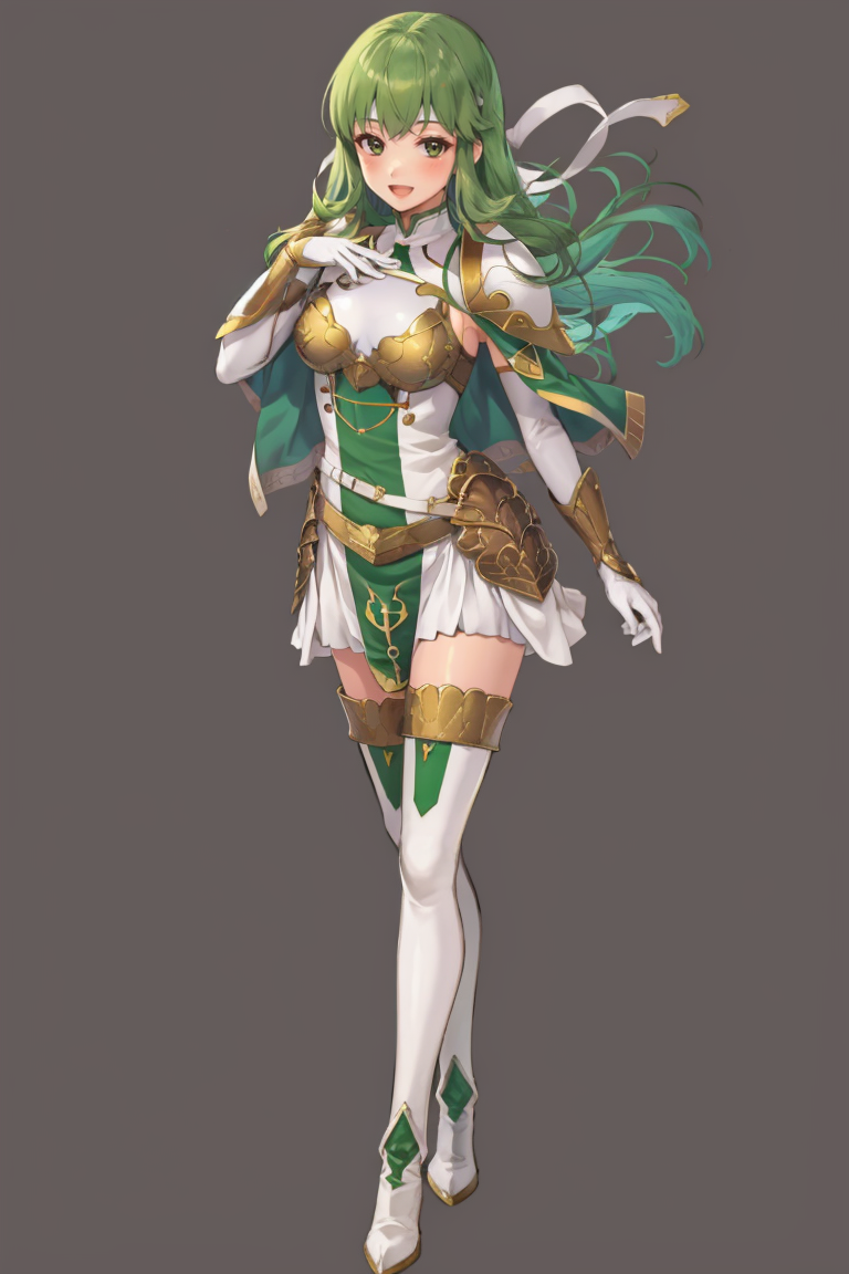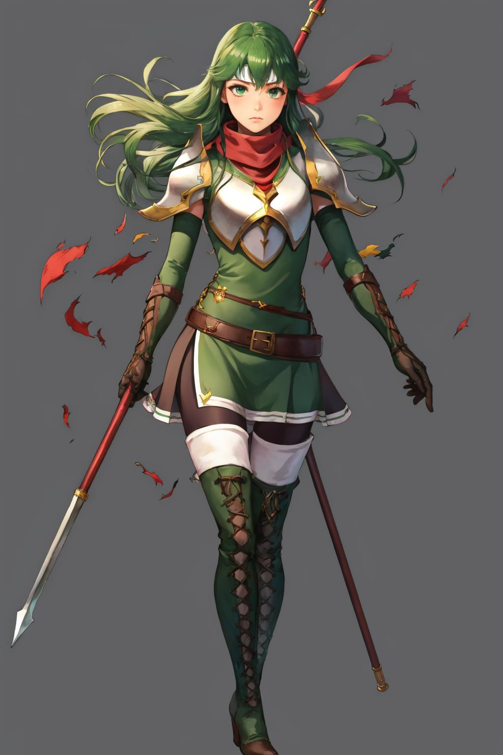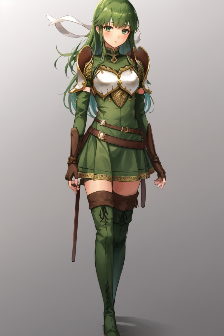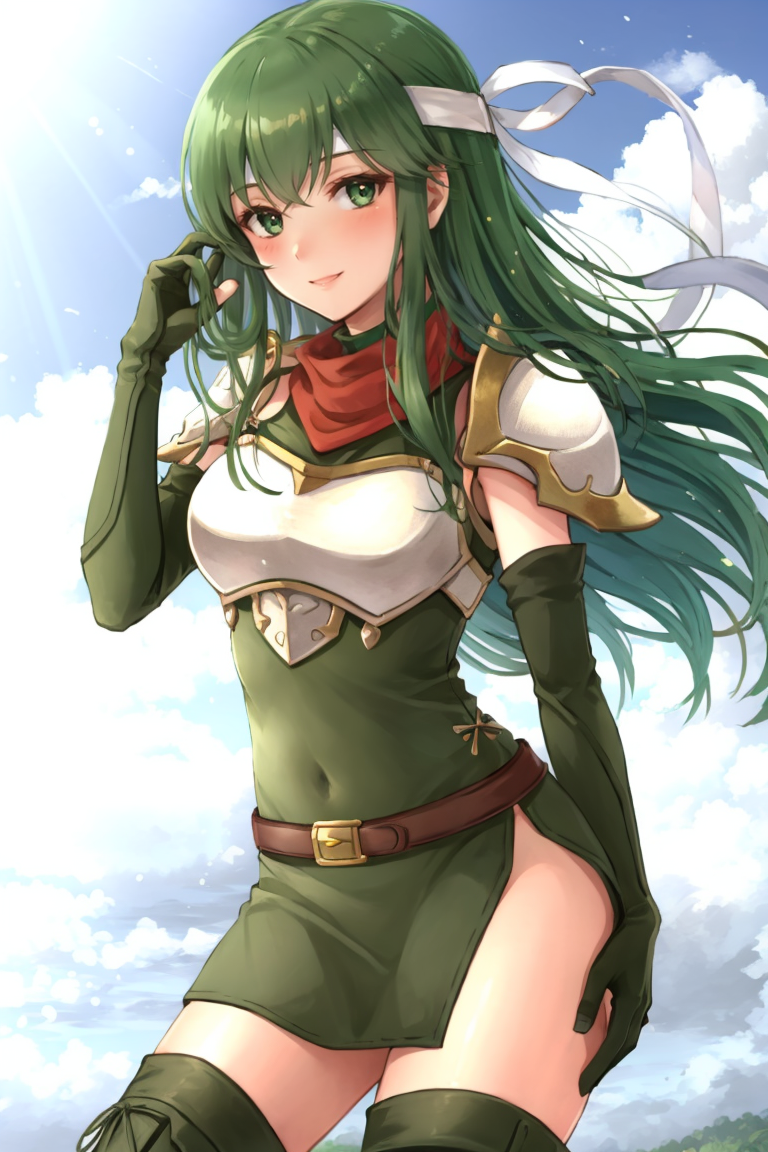 New Mystery: palla_newmystery, long hair, dress, (green elbow gloves:1.3), belt, (green fingerless gloves:1.3), armor, covered navel, green thigh boots, short dress, shoulder armor, side slit, breastplate, white headband, pegasus knight uniform (fire emblem).