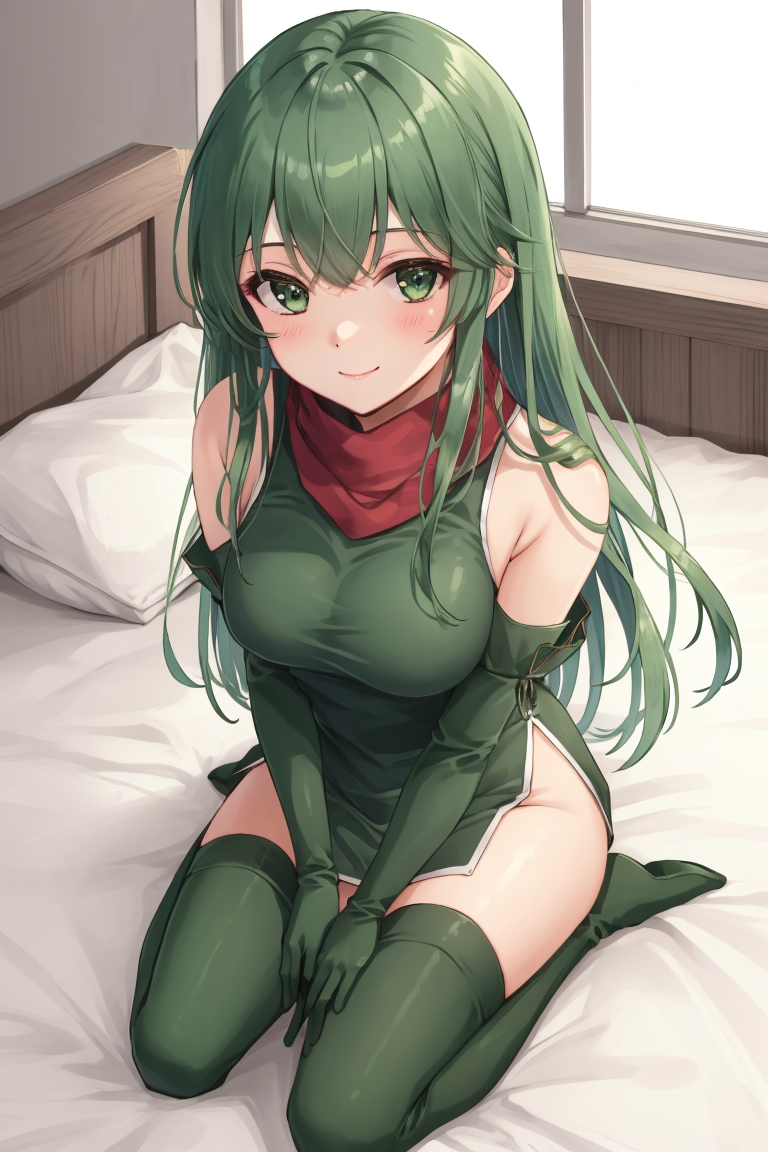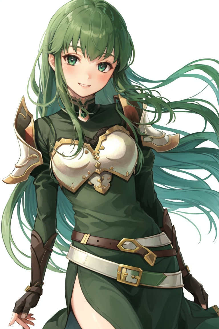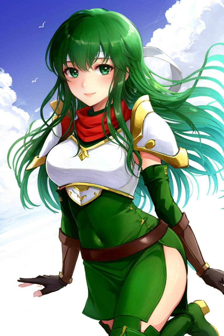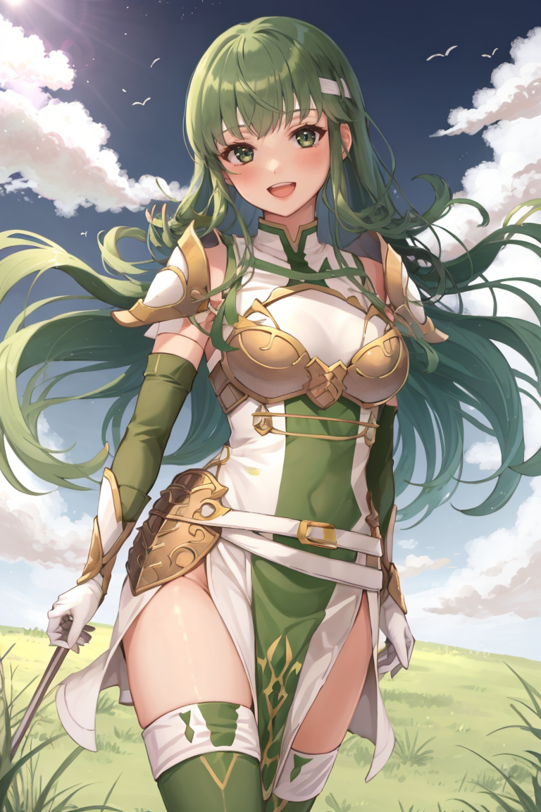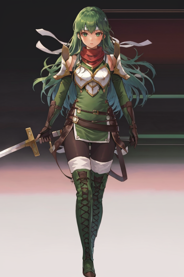 New Mystery: palla_newmystery, long hair, dress, (green elbow gloves:1.3), belt, (green fingerless gloves:1.3), armor, covered navel, green thigh boots, short dress, shoulder armor, side slit, breastplate, white headband, pegasus knight uniform (fire emblem).