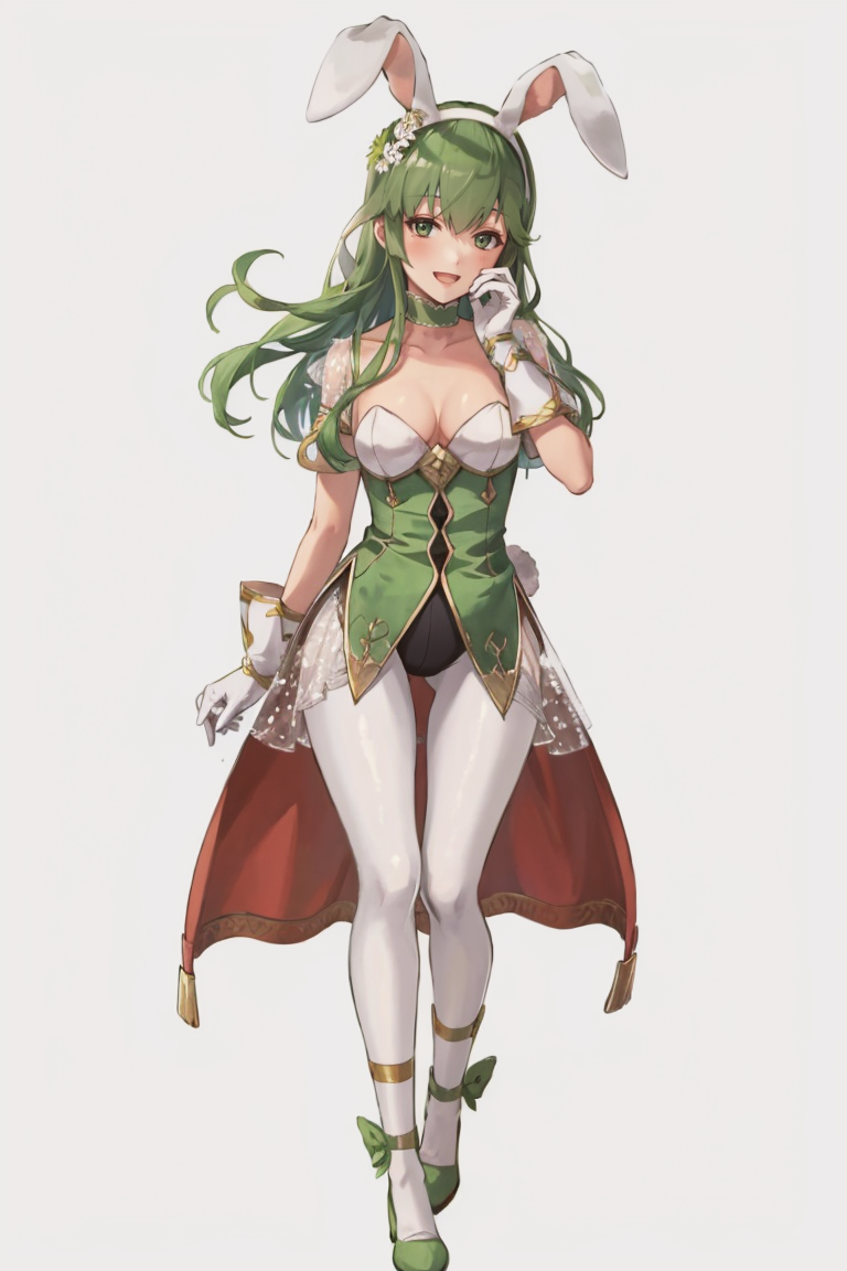 Easter: palla_easter, long hair, hair ornament, gloves, animal ears, cleavage, tail, full body, flower, pantyhose, white gloves, hair flower, rabbit ears, leotard, fake animal ears, playboy bunny, rabbit tail, white pantyhose, green footwear.