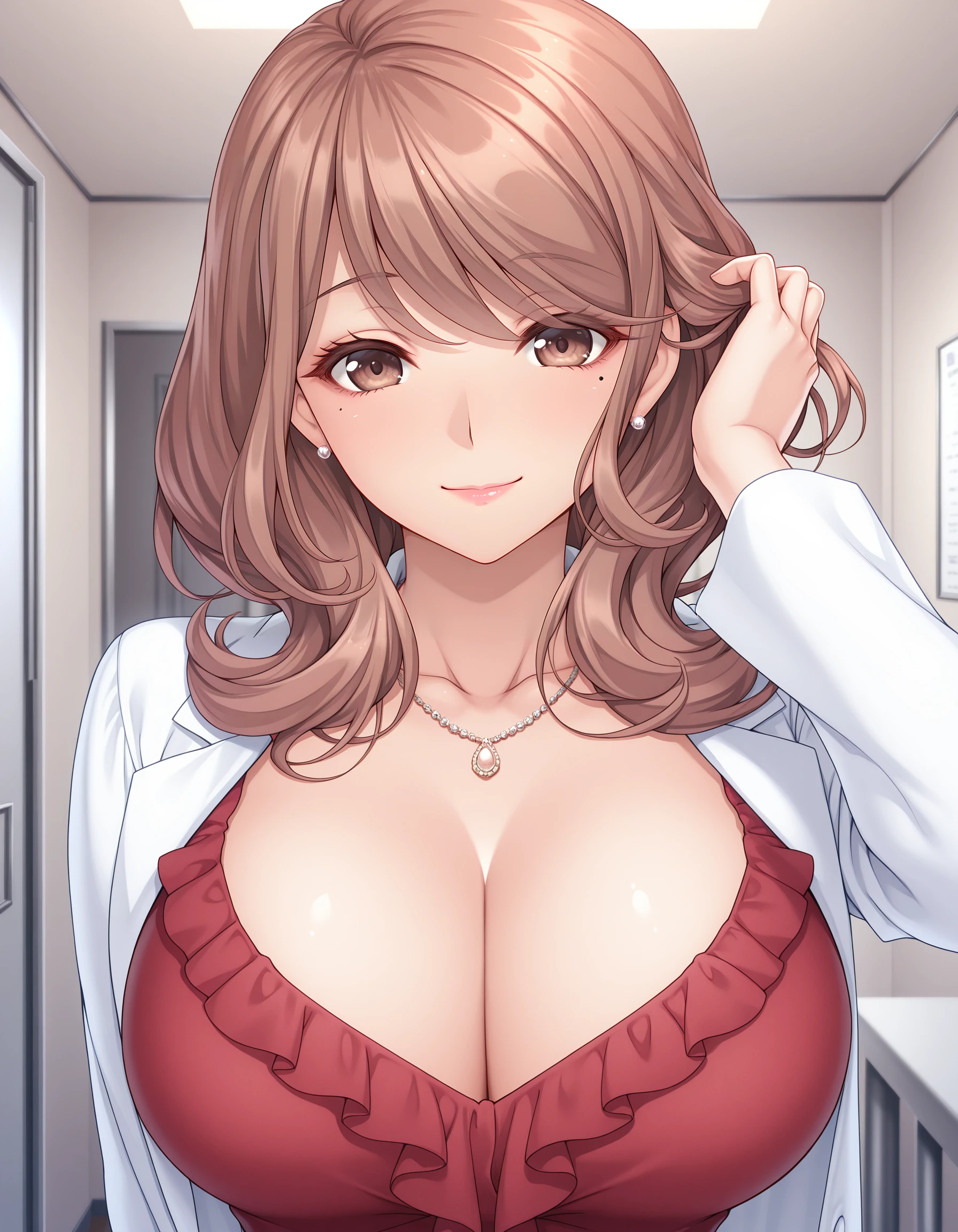 machikoerocas,1girl,medium hair,brown hair,brown eyes,large breasts,mole under eye (recommend put multiple moles in negative prompt),lips