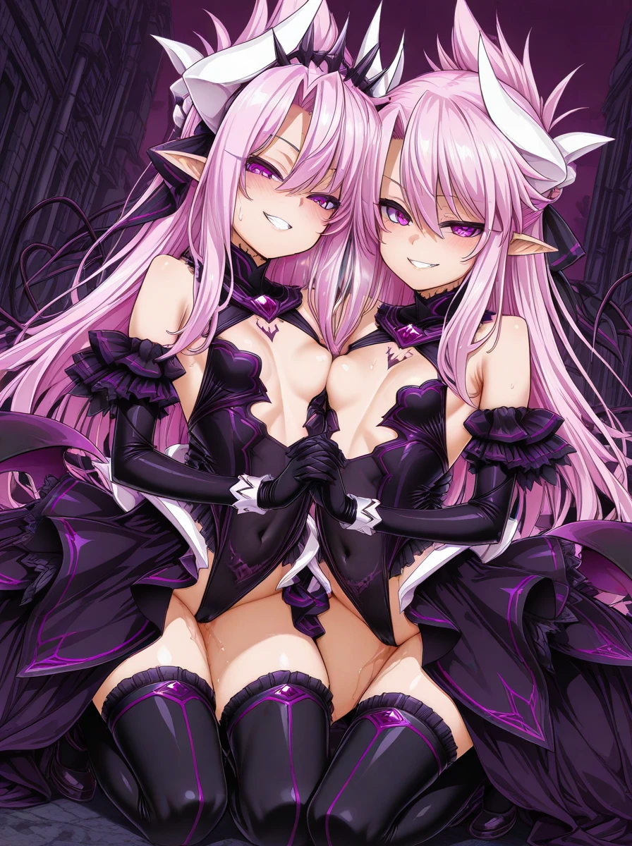 white horns, pointy ears, neck tattoo, purple eyes, demon wings, tiara, corruption, pubic tattoo, demon tail, thighhighs, elbow gloves, collar, showgirl skirt, pink hair,